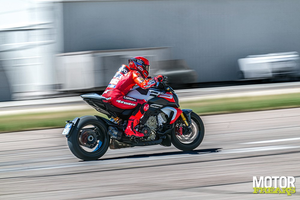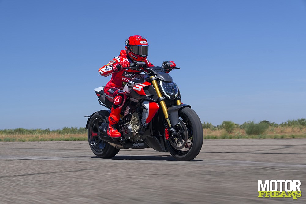 Onderhuids draait alles om de 1.103 cc Desmosedici Stradale V4, goed voor 182 pk bij 13.500 toeren en nog meer punch dan de Diavel V4 Granturismo. Het blok is verfijnd voor soepelheid onderin, maar losbandig en explosief zodra de naald richting rood klimt. Daarbij helpt een nieuwe quickshifter (DQS 2.0), dezelfde droge koppeling als de superbikes en slimme elektronica met o.a. Riding Modes (waaronder voor het eerst ‘Race’), launch control en een dashboard dat duidelijk leentjebuur speelt bij de Panigale.