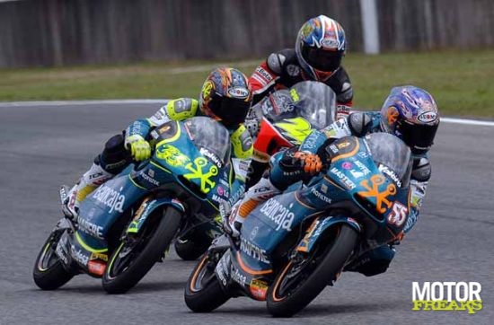 Door de tempoversnelling vooraan konden een aantal coureurs niet volgen en werd de groep uitgedund tot zeven coureurs bestaande uit Faubel, Pasini, Corsi, Talmacsi, de Rosa, Koyama en..Gadea! Die laatste had een twintigste trainingstijd gerealiseerd, kwam na de eerste ronde als twaalfde door en had zich gestaag naar voren gewerkt. Met nog vier ronden te gaan werd Andrea Iannone, die het door versleten banden al een aantal ronden moeilijk had, door een highsider hard van zijn machine geworpen en de op de achtste plaats rijdende Sandro Cortese (EmmiCafeLatte-Aprilia) wist Tomoyoshi Koyama te verschalken.