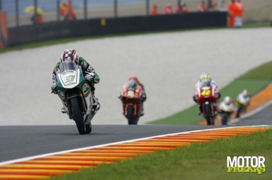 Mattia Pasini kende minder geluk want na een tijdlang in de kopgroep te hebben meegestreden verloor hij het in de laatste twee ronden, mede door het rijden van Rafaelle de Rosa, en werd "slechts" zesde. Cortese, Smith, Espargaro en Zanetti maakten de top tien vol. Ranseder, Terol, Krummenacher, de Rosa (opgekrabbeld na zijn crash met Pesek die dure punten liet liggen en nu zowel Faubel als Talmacsi in de tussenstand voor zich moet dulden) en Aegeter pakten ook nog punten.