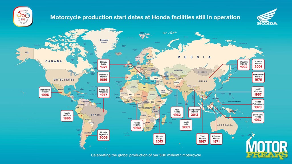 Honda begon in 1963 met de massaproductie van motoren in haar eerste overzeese productiefaciliteit in België en heeft sindsdien haar productie wereldwijd uitgebreid in overeenstemming met haar basisprincipe van "lokaal produceren waar vraag is".
