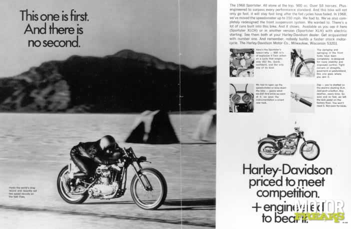 De Harley-Davidson Sportster ontstond als reactie op de felle concurrentie van Britse merken als Triumph en Norton. De basis was het K-model (1952-1956) met zijn ‘unit constructie’ carters, maar de zijkleppen van het 883cc blok werden vervangen door bovenliggende kleppen. Voor die tijd had de fiets vooruitstrevende hydraulische voor- en achtervering.