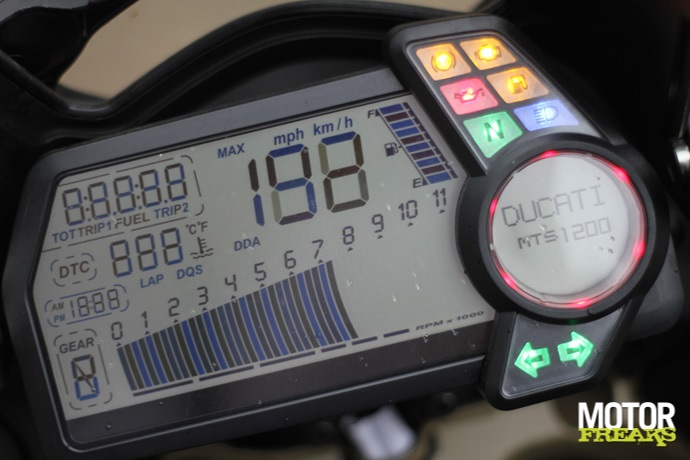 Dat ze in Italië daar met vlag en wimpel in zijn geslaagd zal je meteen duidelijk worden zodra je je rechterbeen over het zadel hebt geslagen. Deze 1200 S Touring uitvoering, die meteen de duurste versie is die Ducati op de markt heeft gezet, is voorzien van de meest exotische gadgets die je maar kunt bedenken: Ducati's instelbare Traction Control, ABS, elektronisch geregelde vering en een keuze uit vier verschillende settings, Sport, Tour, Urban en Enduro, waarbij niet alleen de vering maar ook het vermogen van de 150 pk sterke uit de 1198 afkomstige L-Twin wordt aangepast. Zelfs de bekende contactsleutel heeft plaats moeten maken voor een elektronisch exemplaar, het enige waarvoor de in de zender wel aanwezige contactsleutel moet worden gebruikt is de benzinetank, het zadel en de zijkoffers waarmee deze Tour versie standaard is uitgerust.