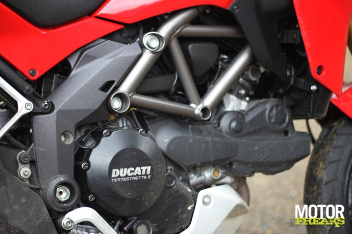 De Multistrada 1200 heeft zoals gezegd 1198,4 cc aan twinpower, vloeistofgekoeld en voorzien van 4 kleppen per cilinder, en daarmee meteen het grote verschil met de oude luchtgekoelde 1100 DS. Een motorblok dat van de sportieve 1198 werd geleend en voorzien van een nieuwe 11° klepoverlap voor een soepelere vermogensafgifte, die werd verminderd tot 'slechts' 150 pk. Dat, in combinatie met het enorm wendbare rijwielgedeelte, garant staat voor het betere stuurwerk. In Sportstand strak genoeg om aan het achterwiel van een 1198 te kunnen plakken en in Endurostand soepel genoeg om alle oneffenheden die het Belgische wegdek rijk te slikken alsof je op een zwevend tapijt aan het rijden bent.