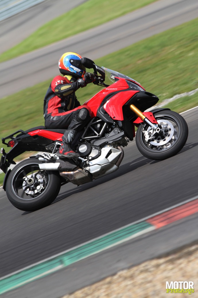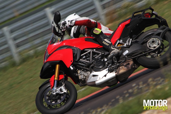 Vermogen wat de Multistrada 1200S meer dan voldoende in huis heeft. Het 11° Testastretta motorblok is potenter dan Hulk Hogan in topconditie en beschikt bovendien over een uitstekend traction control, waardoor net als de KTM ongegeneerd het gas kan worden opengedraaid zonder door een klassieke highsider te worden bestraft, maar dan met een punch die het de SMT ontbreekt. En dat is niet vreemd, per slot van rekening is het blok een afgeleide van de 1198 en doet qua vermogen maar weinig onder ten opzichte van zijn Superbike broer. Tel daarbij op dat de fiets is gezegend met een uitstekend rijwielgedeelte en perfecte elektronisch geregelde Öhlins vering en je hebt een fiets die het beste van alle werelden kan verenigen. Mooi om te zien, enorm wendbaar, comfortabel op 't lange werk en bovendien – net als de KTM – een serieuze kandidaat op het circuit. Niet alleen op korte banen als Mettet, maar ook snelle banen dankzij z'n potente motorblok. Maar dan zul je wel wat aan de grondspeling moeten doen. En bereid willen zijn diep in de buidel te tasten.