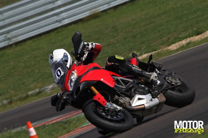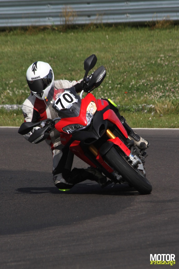 Zo goed als de Multistrada ons op straat was bevallen, zo teleurstellend is echter de eerste kennismaking met de fiets op het circuit. Dankzij een eerdere test met de anniversary GSX-R'en op dit circuit is de baan bekend waardoor we ons meteen op de fiets kunnen concentreren, maar nog voor de eerste sessie ten einde is besluit ik wijselijk met de fiets de baan te verlaten. De Multistrada wordt in Sportstand de baan over gejaagd en blijkt al snel een chronisch gebrek aan grondspeling te hebben. Zowel links als rechts maken schraapgeluiden en bijbehorende vonkenregens al snel een einde aan de pret en alsof dat niet erg genoeg is blijkt het ABS systeem wel heel erg vroeg in te grijpen. Nu kan er nog steeds wel flink vertraagd worden, maar trillingen in het remhandle maken duidelijk dat er écht niet harder – en dus niet later – geremd kan worden. Eerst maar eens de paddock opzoeken dus, voordat de gepoetste bovenkant er iets minder gepoetst uitziet, waar wordt geconstateerd dat de middenbok aan beide kanten een stuk lichter is geworden.