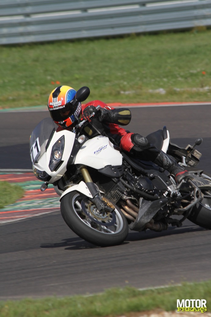 waardoor laat en diep remmen niet voor de tijger is weggelegd. En precies zo wees het uit nadat de Tiger de baan over werd gejaagd. De driecilinderlijnmotor is voelbaar sterker dan de KTM, die ook op Mettet wat timide aanvoelt maar daardoor wel zonder Traction Control ongegeneerd op het gas kan worden gezet, maar heeft niet die 'edge' van de andere twee en laat duidelijk merken dat circuitrijden niet voor 'm weg is gelegd. De motor is misschien iets minder wendbaar dan de andere twee, maar vooral bij aanremmen laat de Tiger het enorm liggen. De voorvering blijkt niet tegen het grove geweld opgewassen, wat resulteert in een snel duikende voorkant die bovendien geen direct gevoel met z'n rijder heeft waardoor je nooit het gevoel hebt precies te weten wat zich vooronder afspeelt en hoe hard – en hoe diep – je de motor de bocht in kunt remmen. Nu zou de Tiger dat dankzij het enorm smeuïge motorblok bij het uitaccelereren kunnen compenseren, ware het niet dat op Mettet er eigenlijk maar twee stukken zijn waar het vermogen écht kan worden aangesproken. Daarnaast blijkt bij de Triumph, net als bij de KTM, de bandenkeuze een beperkende factor te zijn, de fiets is uitgerust met redelijk overjarige Michelin Pilot Road's die op straat nog prima functioneren, maar op het circuit simpelweg té weinig grip genereren, wat Vincent nog op een fraaie streep op straat én in de broek plus een narrow escape komt te staan. En ondanks dat dit vlák voor de fotograaf plaatsvindt, weet deze vakkundig de andere kant op te kijken.