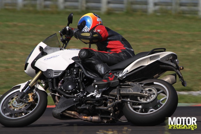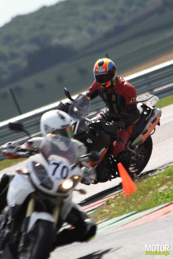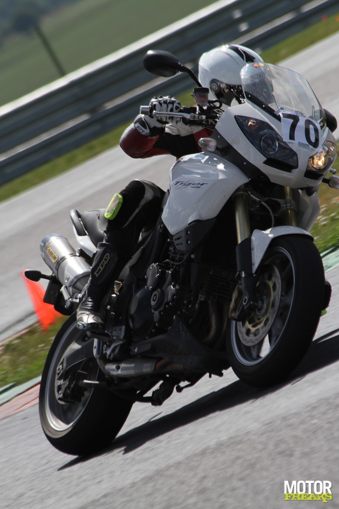 Terwijl de Multistrada en SMT op de baan hun kunsten mogen vertonen moet de Tiger vanaf de kantlijn werkloos toezien. Niet alleen vanwege Meijer's rits-raferelen maar eigenlijk meer vanwege de gemonteerde Arrow aftermarket einddemper die niet was voorzien van een verplichte dB-killer en daardoor niet op de baan werd toegelaten. Een flinke discussie met enkele oneerzame voorstellen later (waar we liever niet meer aan herinnerd willen worden) krijgen we groen licht van de circuiteigenaar en kan ook de Tiger de baan op worden gestuurd, terwijl het aanwezige Motorpaint Alphen Raceteam uitkomst heeft geboden door de middenbok van de Multistrada te verwijderen. Vol goede moed wordt de Italiaan opnieuw de sporen gegeven, maar de grondspeling blijkt nog steeds niet afdoende te zijn. Behoudens voetsteunen is er langs rechts niets meer aan de hand, maar aan de linkerkant weet Vincent achtereenvolgens zijstandaard én schakelpook aan het asfalt te krijgen, wat op een baan als Mettet met negen linker en maar twee rechterbochten niet bepaald hoopgevend is. Het ABS kan gelukkig eenvoudig worden uitgeschakeld, waardoor er nu wél serieus kan worden geankerd.