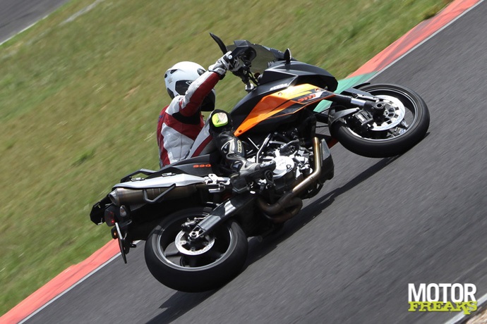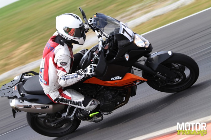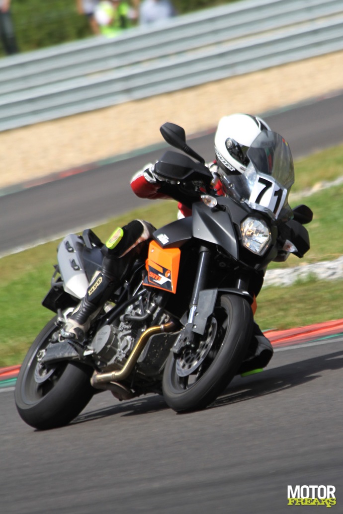 De SMT is daarentegen een heel ander verhaal, de motor werd door KTM ontwikkeld als afgeleide van de Supermoto 990 en heeft duidelijk dezelfde roots als die maxi-motard. Wat heeft geresulteerd in een stuurgeile fiets naar hartelust elke bocht op zal vreten. Bovendien zijn net als bij de Tiger eenvoudig koffers te monteren waardoor ook een weekendje weg probleemloos zal gaan. Z'n belangrijkste troef speelt de SMT echter uit op het circuit, waar de compacte bouw, uitstekende remmen en dito rijwielgedeelte de motor met speels gemak de baan over laat jagen. Nadeel is echter het motorblok, dat – zeker in dit gezelschap – redelijk tam aanvoelt en waardoor je bij bovengemiddeld tempo de twin al snel uit zult gaan melken. Een circuit als Mettet is nog nét te doen, maar alles wat langer (lees: sneller) is zou je wensen wat meer vermogen tot je beschikking te hebben.