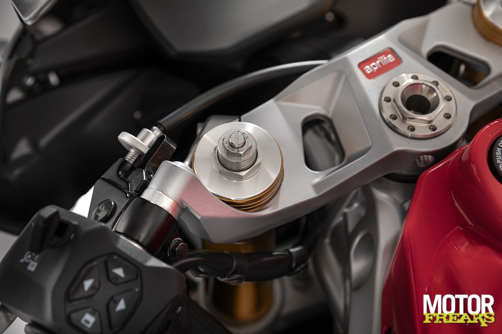 Doordat het uitlaatsysteem onder het blok is geplaatst ontstond er in het ontwerp meer vrijheid om de voetsteunen van de duopassagier zo optimaal mogelijk te kiezen - lees: niet super hoog omdat er geen rekening hoeft te worden gehouden met de einddemper. Het kontje is trouwens - net als de rest van het design - geïnspireerd op de RSV4.
