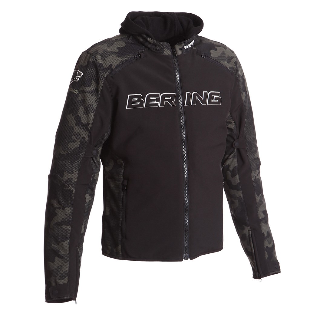 De Jaap EVO kan onder meer geleverd worden in Camo-print. Het ontwerp loopt door op de mouwen en schouders en geeft de textiele jas een stoere urban-look. Het is ook niet te missen dat het hier gaat om een product van Bering, aangezien het logo en de bekende ijsbeer terug te vinden zijn op borst, rug en armen.