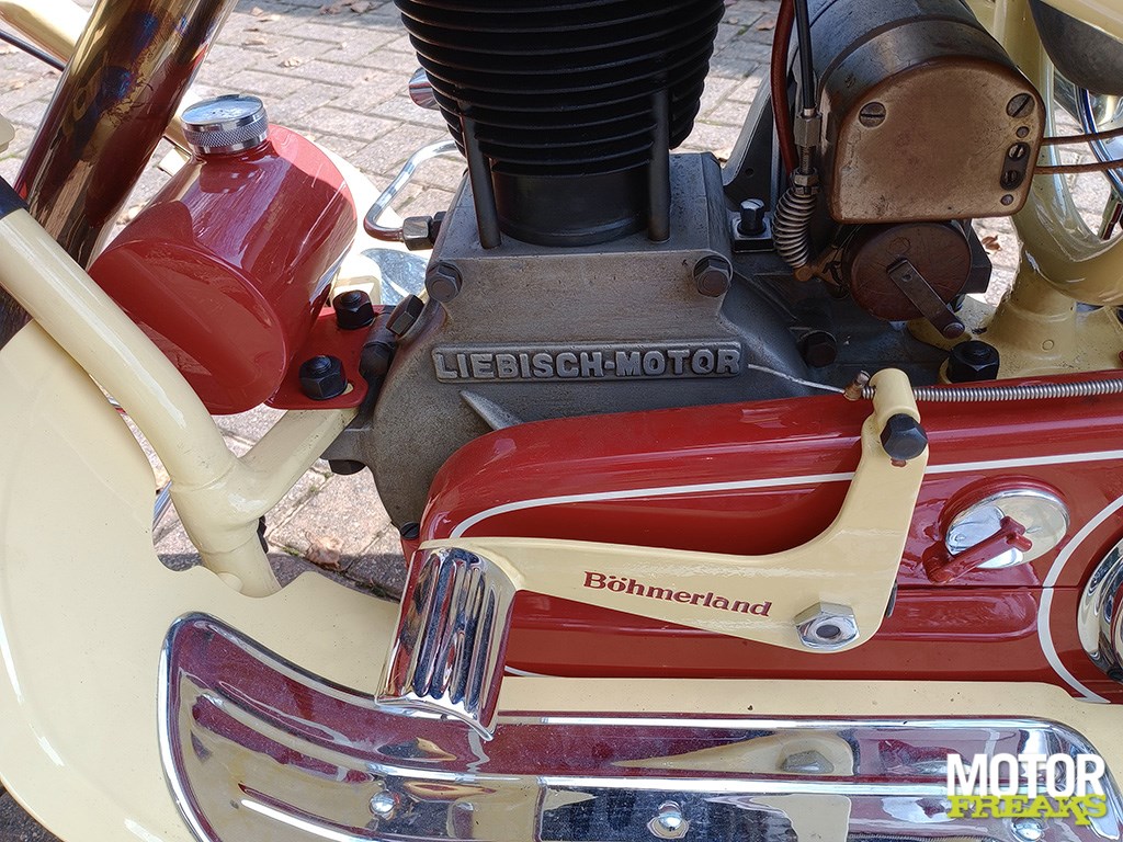 De Böhmerland werd in de jaren ‘20 en ‘30 van de vorige eeuw geproduceerd in Tsjecho-Slowakije en is beroemd om zijn extreem lange buisframe en innovatieve aluminium gietwielen. Deze wielen, die pas in de jaren ‘70 populair werden, zijn tegenwoordig een standaardonderdeel van bijna alle motorfietsen.