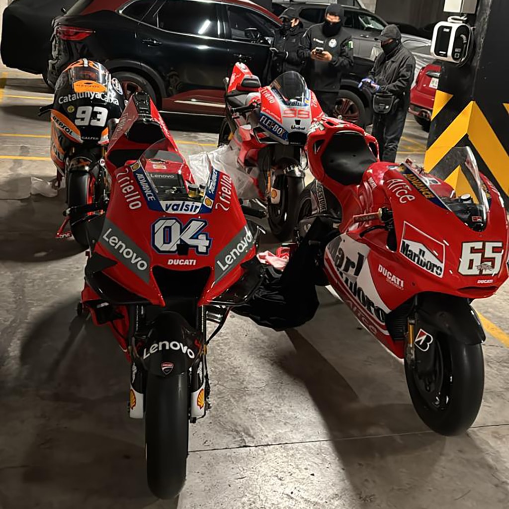 Op foto’s zijn tientallen motoren te zien, keurig opgesteld en gecatalogiseerd, waaronder Ducati MotoGP motoren van Jorge Lorenzo, Loris Capirossi, Andrea Iannone en Valentino Rossi uit zijn moeizame jaren 2011 en 2012 en de Moto2 motor van Marc Marquez. De collectie omvat ook meerdere Honda 500cc Grand Prix motoren en verschillende Kawasaki Superbikes.