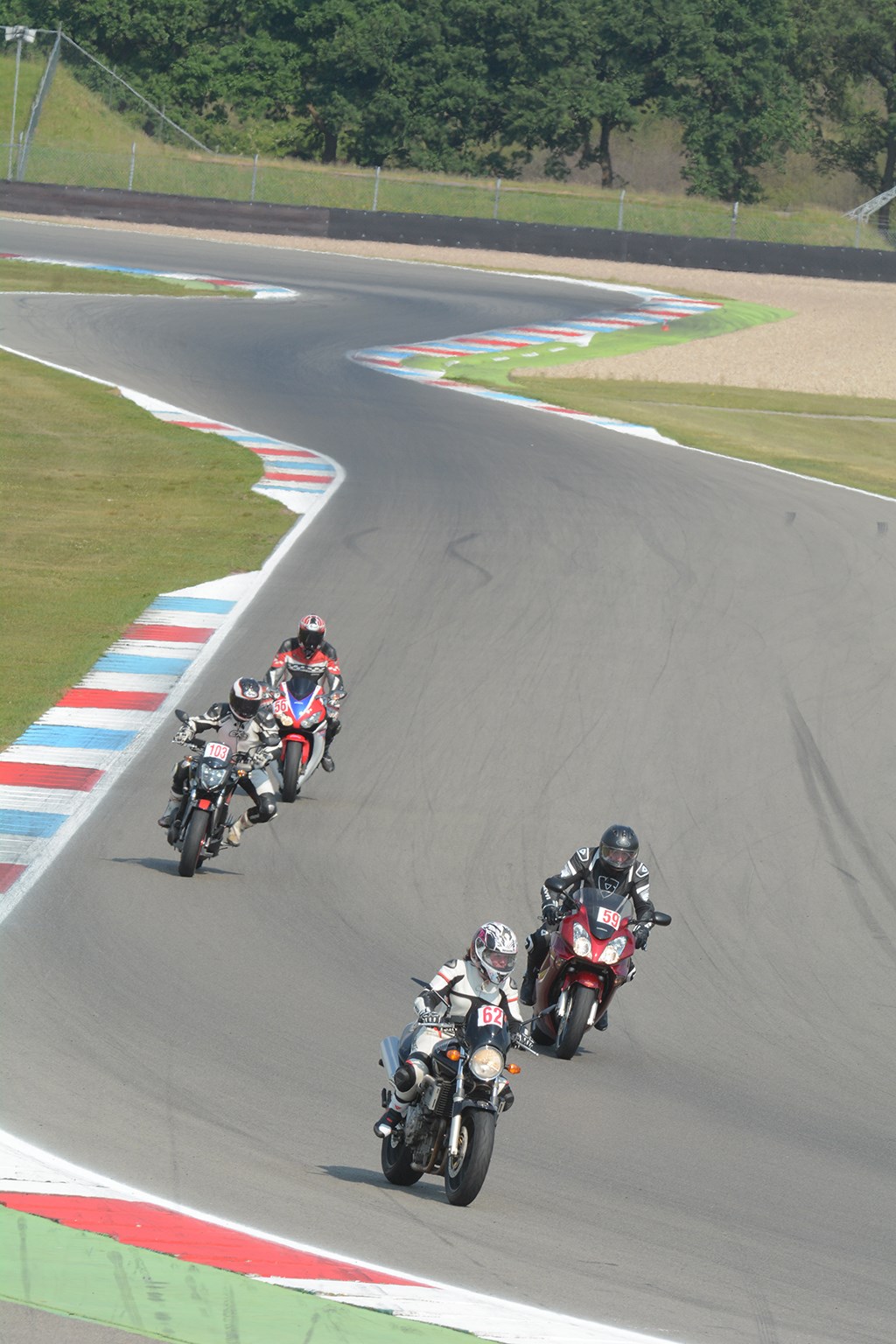 Ook op de ‘echte grote’ baan wordt niemand aan zijn lot overgelaten. Tijdens de ochtendsessies is iedereen door de instructeurs beoordeeld om voor het middagprogramma opnieuw, in de juiste groep te worden ingedeeld. Kleinere groepen ook, met meer instructeurs en zelfs privé als het nodig mocht zijn. Zodoende kan iedereen op zijn eigen niveau, met zijn eigen snelheid rondrijden, wat een boel frustraties voorkomt. En met oplettende instructeurs is het tegenkomen van een langzamere groep ook niet zo’n probleem, inhalen gebeurt heel ordentelijk en vlot zodat iedereen zo veel mogelijk plezier beleeft.