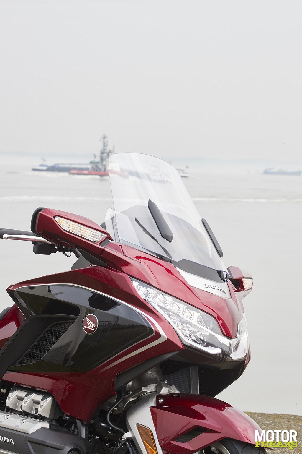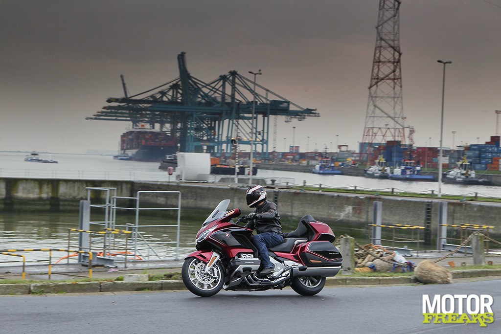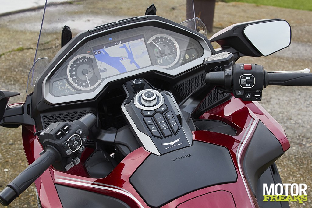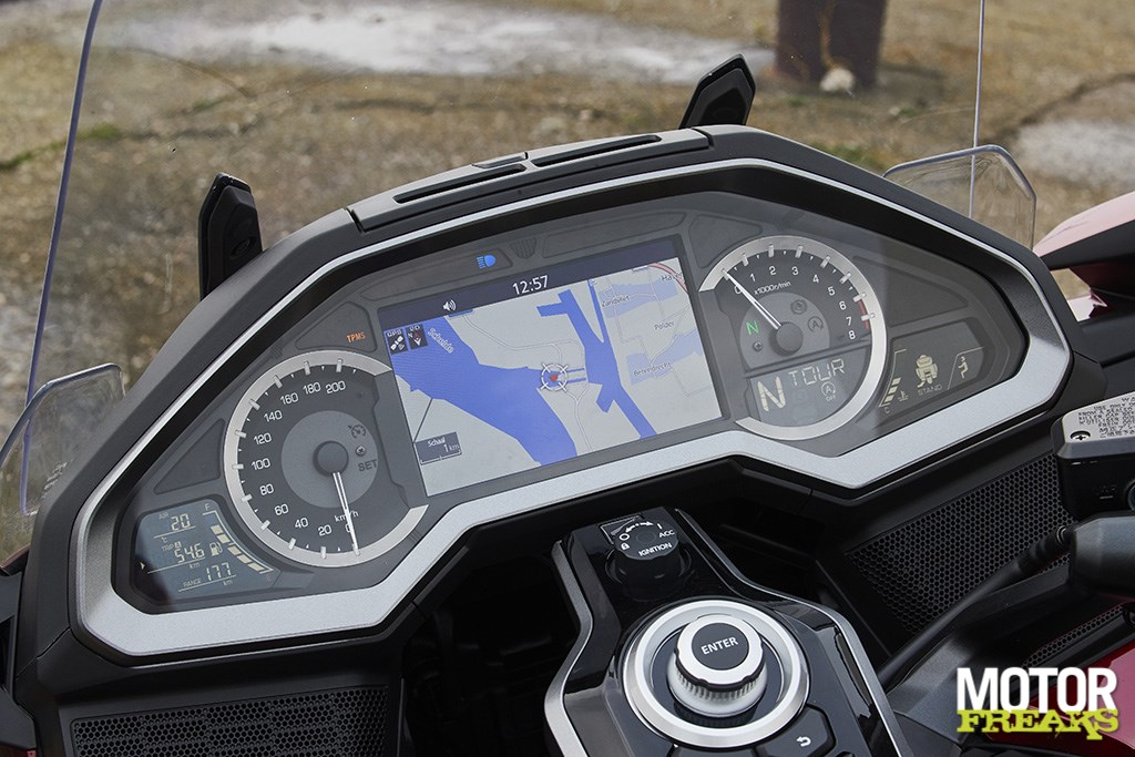 Natuurlijk ontgaat ons de ironie niet om uitgerekend met de Gold Wing dit terrein van Superschepen te betreden, maar onze interesse gaat veel meer uit naar wat zich voor ons ontvouwt. En dat is, zoals gewoonlijk bij een Gold Wing, aanzienlijk. Om te beginnen met het multifunctionele TFT display pal voor ons, gewoon omdat dat nu eenmaal nog het meest in het oog springt. Is ook moeilijk te missen, zoiets.