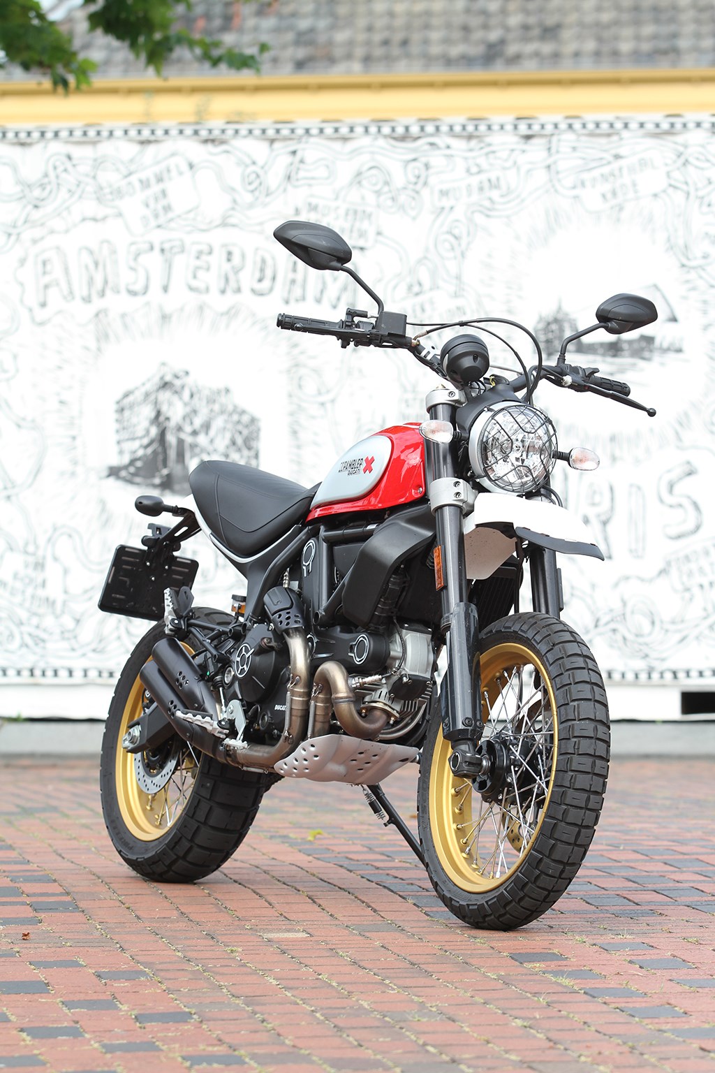 Het was natuurlijk al even rumoerig rond de gouwe ouwe, de luchtgekoelde tweecilinder waar Ducati naam en faam mee heeft gemaakt. Was er ooit een tijd dat elke Ducati werd aangedreven door zo’n machine, met de invoering van waterkoeling, injectie en verfijning van de layout van klepoverlap en mappings wist de watergekoelde vierklepper meer en meer terrein te winnen. En terecht ook, want de prestaties liegen er niet om. En met de huidige emissieeisen is het al helemaal bal… het is voor elke fabrikant inmiddels een wonder als er nog iets met koelribben door de norm heen komt. Desalniettemin is ook Ducati niet vies van ‘eer uw ouderen’ en daarom is de luchtkoeler toch in één of andere vorm in het gamma gebleven. Totdat ineens besloten werd dat de ‘kleine’ Monster, de 796, het veld moest ruimen. Toen waren er ineens nog maar twee Monsters, een 1200 en een 821, beide voorzien van watergekoeld blok. Dat kan natuurlijk niet, wist ook Ducati, maar het was niet anders. Totdat de Scrambler z’n intrede deed. Een eerbetoon aan een klassiek model is niet af zonder een passend blok en warempel: daar was de tweeklepper weer.