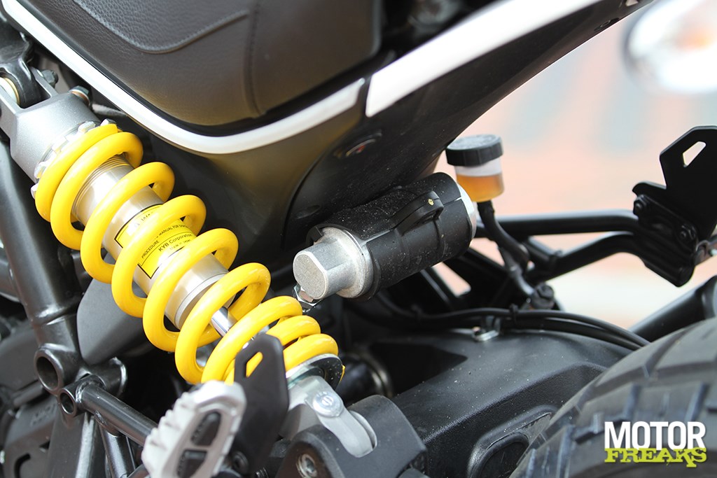 Zo bekeken is de Desert Sled wel wat beter uitgerust. Kan ook wel, want het prijsverschil zul je toch ergens terug moeten vinden. In de betere componenten dus, waar de vering een goed aandeel in heeft. Frame en achterbrug zijn bijvoorbeeld hetzelfde als alle andere Scramblers, dus die hoeven niet noodzakelijk duurder te zijn. De vering wél: met een langere voorvork en langere achterschokbreker komt de Desert Sled op z’n werkhoogte, waarbij we dus een instelbare voor en achterkant hebben, inclusief remote reservoir op de schokbreker. En nou is het altijd wel een beetje een discussie of een model als dit nou hard afgeveerd moet worden of juist niet, al naar gelang of je het een wegmotor met looks vindt of een meer gemengd inzetgebied verwacht wat ook nog goed gaat op de weg, maar eigenlijk is het vooral best oké en in balans. En het kan aangepast worden, als je zou willen. Het houdt ons in elk geval niet tegen er eens flink voor te gaan zitten en eenmaal achter de Monster aan fluitend in het achterwiel te blijven, ongeacht de moeite die de voorste rijder doet.