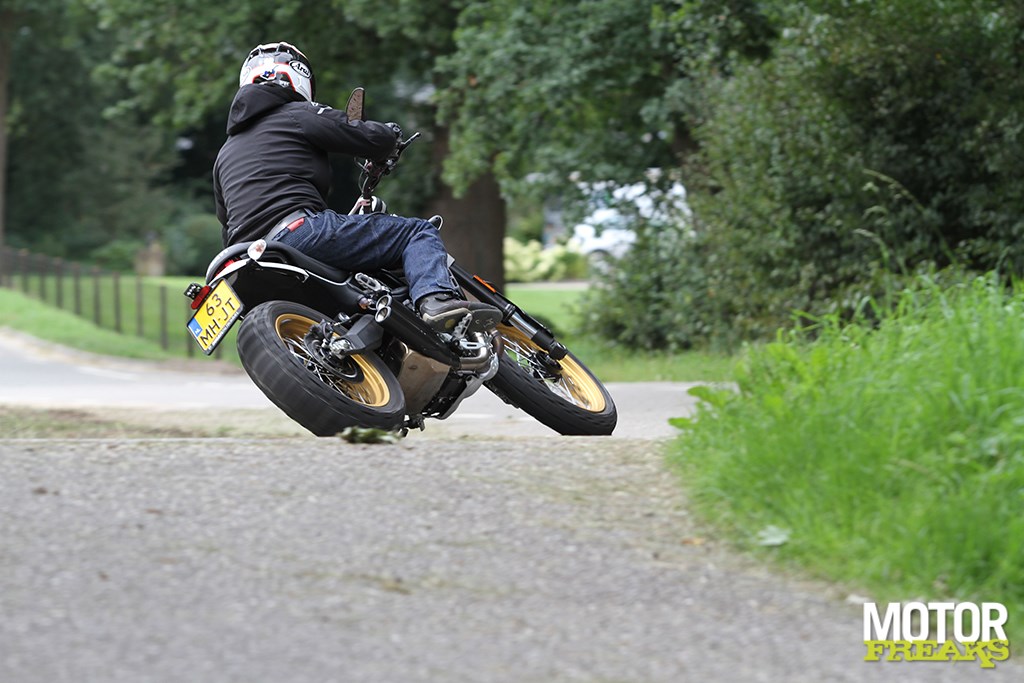 Hadden we vooraf nog een paar kleine vraagtekens bij de banden van de Scrambler en het gripniveau daarvan, al snel bleek dat nergens op gebaseerd. Je zult ongetwijfeld wat meer slijtage gaan zien door het profiel, maar aan grip heb je in elk geval geen gebrek. En je kunt hiermee tenminste nog een beetje weg komen op gravel. Zie het als een supermoto met iets meer profiel, dat gaat immers ook prima. En daarover gesproken… zo is er ook mee te rijden. Na de eerste openbare-weg-bochten op de normale manier kon ook de Desert Sled zijn kunnen laten zien bij de fotobocht en dat was misschien nog een grotere verrassing dan het draaigedrag van de Monster. Was ik daarmee al tevreden de voetsteunen op een haar na aan de weg te rijden (de tenen helemaal, daarom weet ik dat),