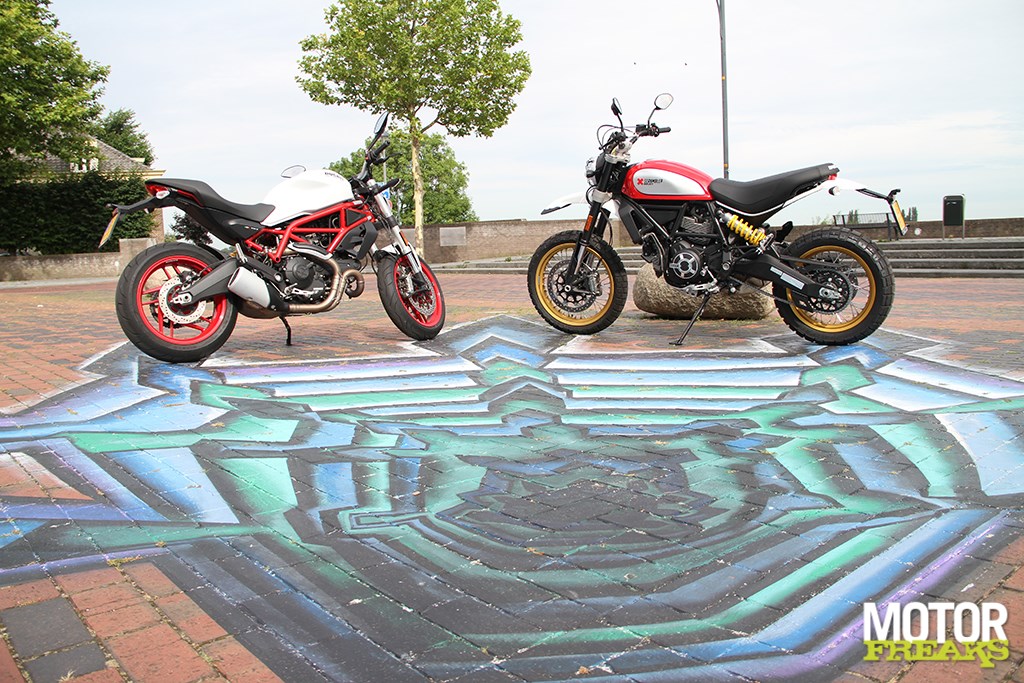 Het behoeft geen toelichting dat de motoren anders sturen. Neem een willekeurige naked en vergelijk die met een eh.. zoiets als de Desert Sled en je kunt op je vingers natellen dat dat anders gaat reageren en dat klopt dan ook flink. Zeker bij overstappen van de een op de ander wordt dat verschil nog eens extra duidelijk. De Monster is niet super groot, maar lijkt nog kleiner als je van de Desert Sled af komt en andersom is de Scrambler wel iets hoger, maar niet zo reusachtig als het lijkt als je net de 797 gereden hebt. Maar het is nog leuker als je ze op hun eigen kunnen beoordeelt. De Monster is zoals gezegd weer een flinke stap richting het