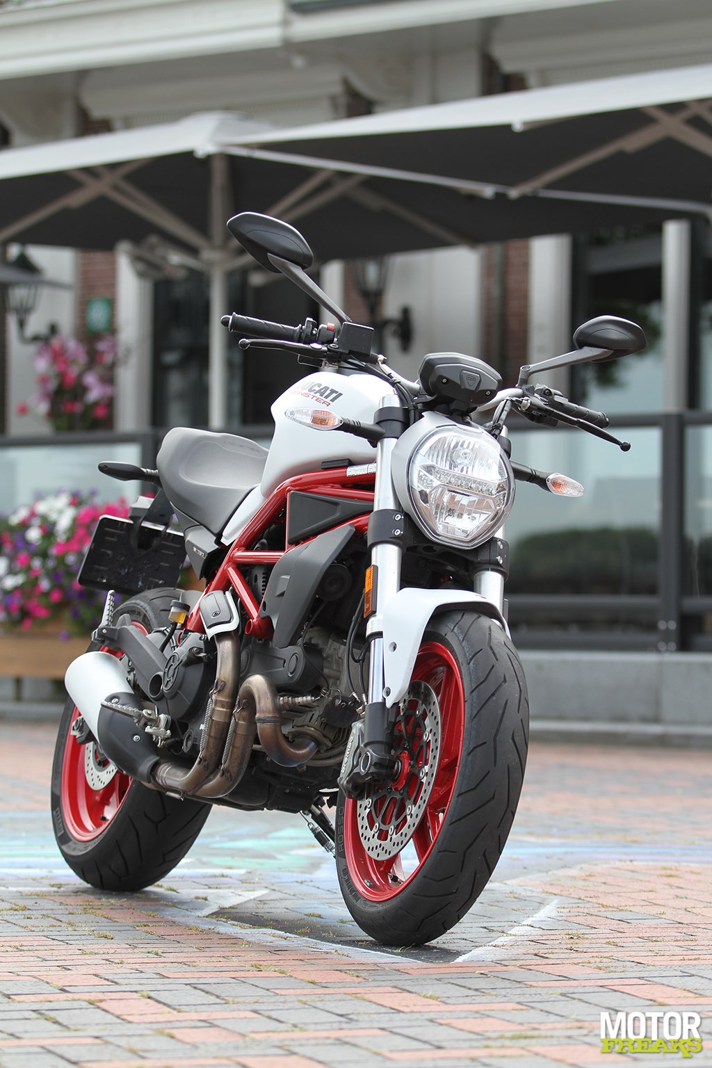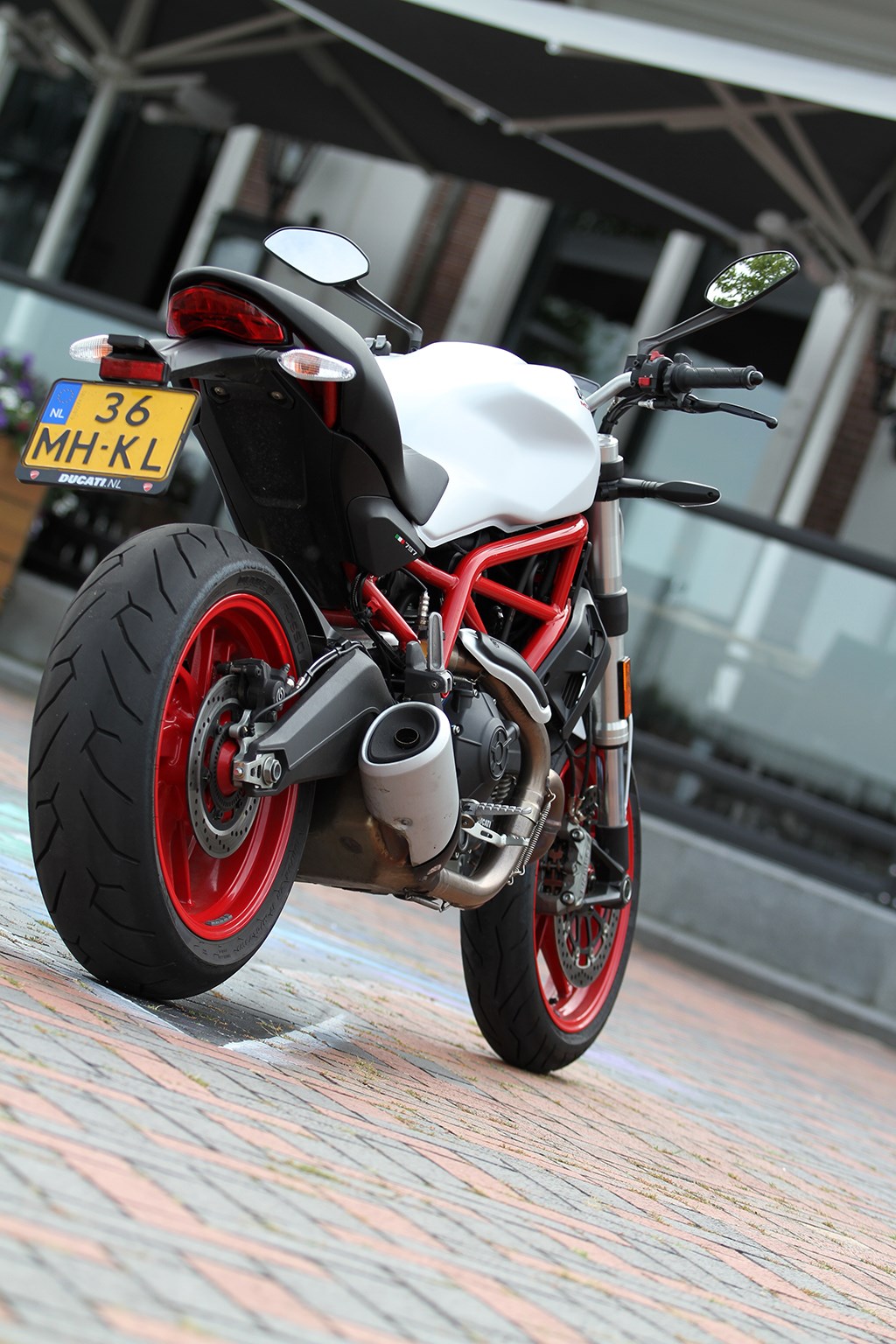 Met de tweecilinder in het vooronder is de motor uiteraard ook iets zwaarder, maar wat belangrijker is: sterker én soepeler. Simpel sommetje eigenlijk: twee cilinders in plaats van één, da’s alles. Maar het is allemaal binnen de perken die je onbewust stelt. Het plaatje klopt, de vertaling eveneens. En als je het rationeel bekijkt is de zitpositie nog steeds dik in orde. De tank is smal waar je het verwacht, de voetsteunen staan op de juiste hoogte, het zadel is vlak en hard genoeg, ga zo maar door. Zelfs het display dat nog identiek hetzelfde is, past in het totaalplaatje. Dat het zoveel anders kan dan de Monster…