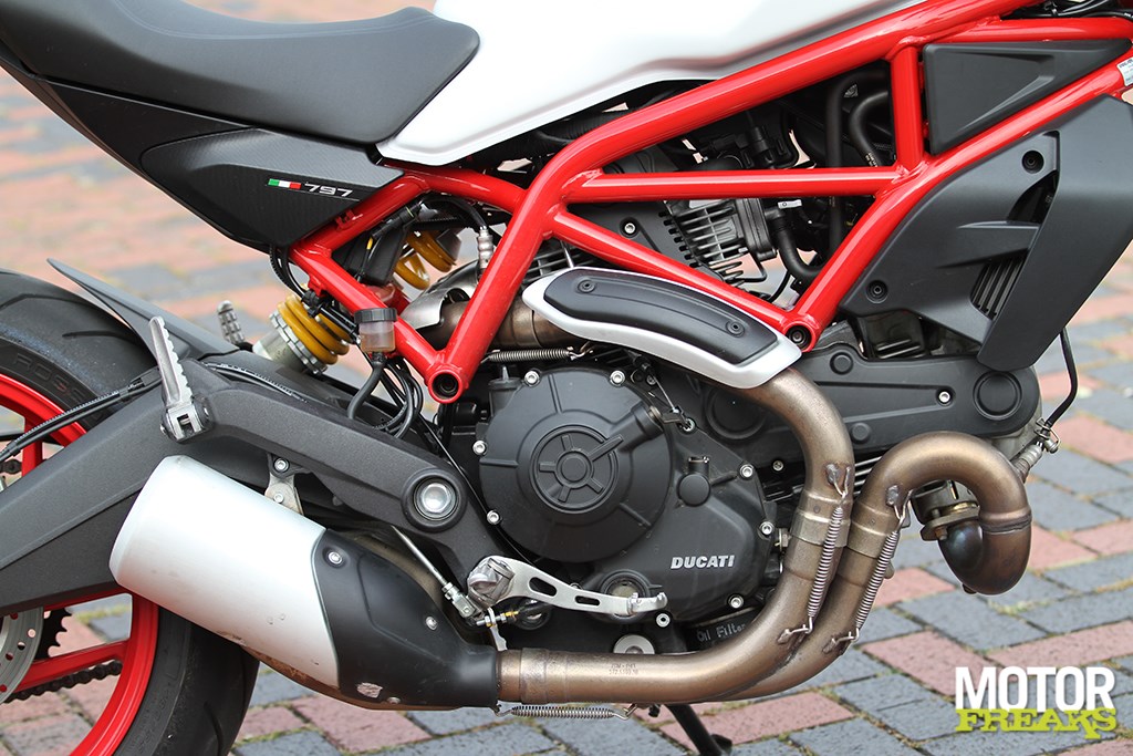 was het ‘kleintje’ Monster ook niet voor een kleintje gewassen. En zo ontstond vanzelf een gat. Een gemis. En dat kwam blijkbaar hard genoeg aan, want de vraag naar een eerlijke, ouderwetse, makkelijke Monster werd almaar groter. Die vraag werd uiteindelijk beantwoord op de Eicma afgelopen november, toen Ducati het doek haalde van niet alleen een nieuwe Monster 1200, maar tegelijk een lieve, kleine Monster 797… met luchtgekoeld blok. Een superidee van Ducati, want met exact dezelfde krachtbron als de Scrambler hebben ze een prima uitgangspunt in handen. Nieuw frame van voor tot achter uit stalen buis, nieuw design, instant een ‘ouderwetse’ Monster.