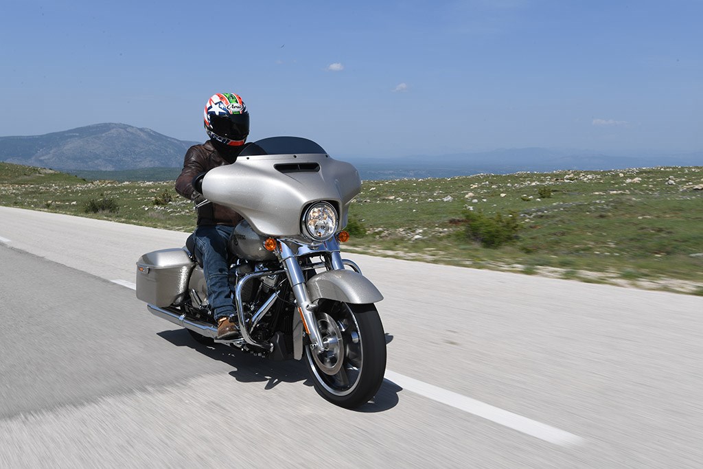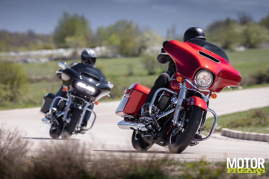 Tijdens de fotoshoot valt meteen op hoe ontzettend gemakkelijk beide Glides op de weg te keren zijn, dankzij de grote stuuruitslag en de lage zit van slechts 695 kilo, maar minstens zo interessant is het verschil tussen beide Glides. Qua gevoel lijkt de Street Glide totaal niet op de Road Glide, zo wordt me snel duidelijk als ik van de Road Glide op de Street Glide ben overgestapt. En word ik dus aangenaam verrast.