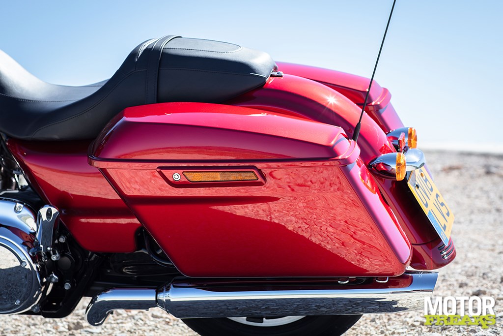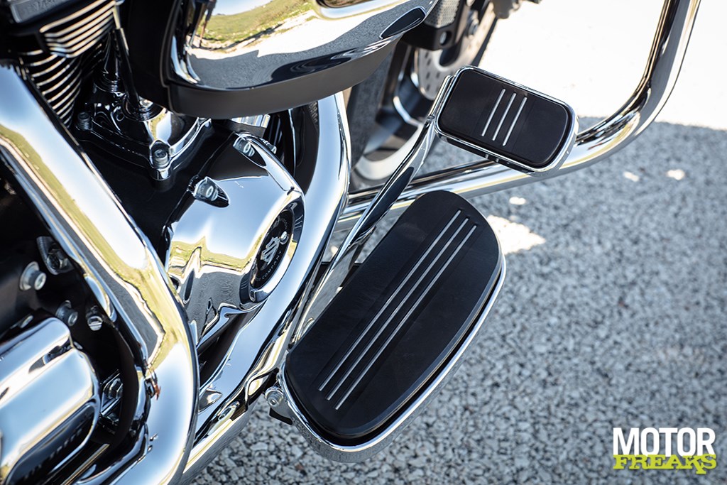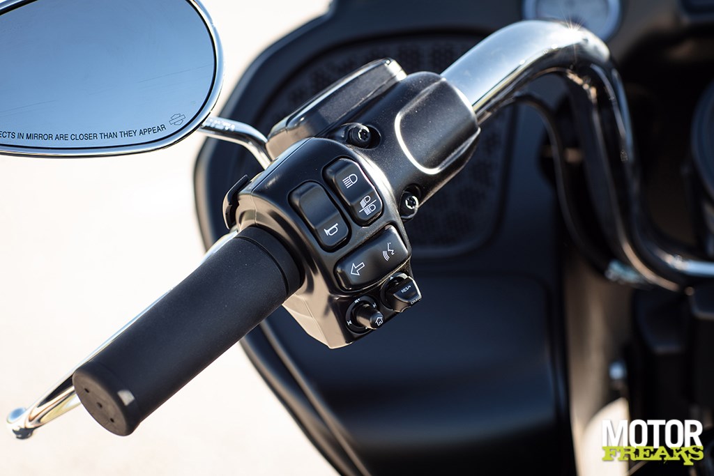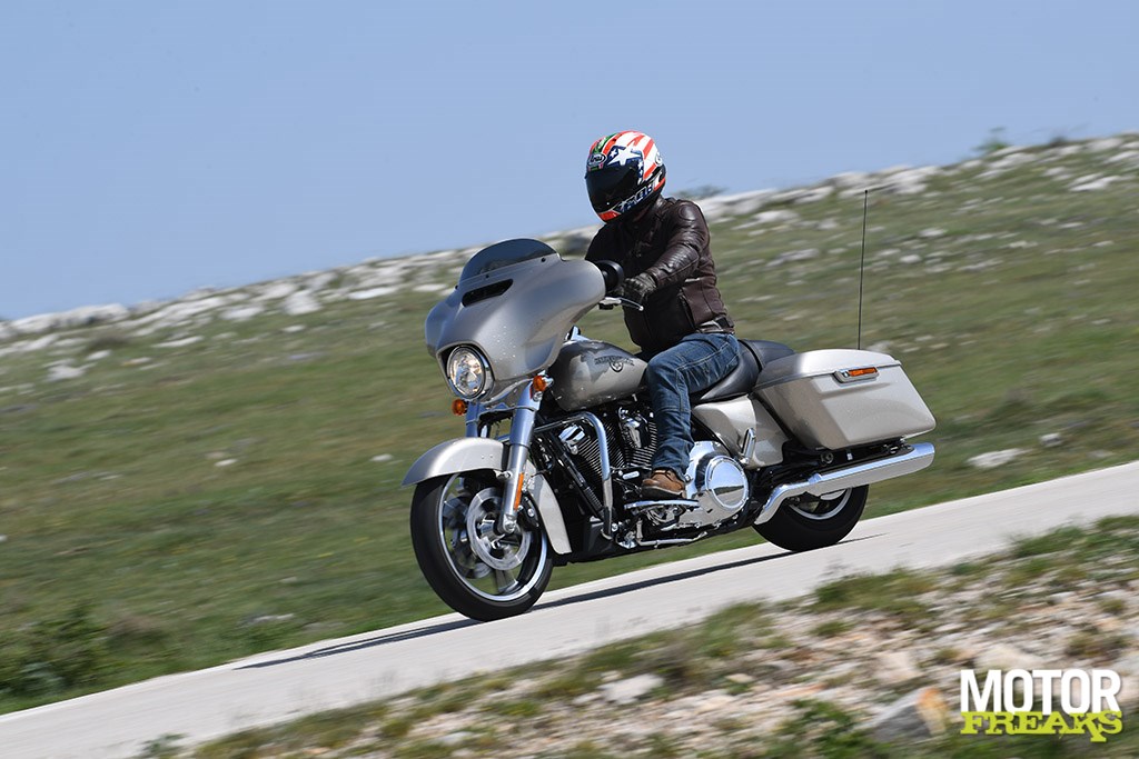 Hoezo een racehelm is geen gezicht?speler op standje 10 en met de cruise control op 90 per uur heerlijk genieten van de natuur, er zijn slechtere manieren om je vrije zondagmiddag door te brengen. Life is Good! Snap nu best waarom hele volksstammen verslingerd zijn geraakt op deze Harley Tourers. Trouwens, over cruisen gesproken. Het Milwaukee Eight motorblok is gezegend met een heerlijk brede, sterke en soepele powerband met een maximum koppel van 150 Nm dat al bij 3.250 toeren per minuut wordt afgegeven, waardoor het geeneens veel uitmaakt in welke versnelling je zit. Van derde tot zesde versnelling is cruisen gegarandeerd. Beide modellen zijn met hak-teen schakeling uitgerust, hoewel dat wat mij betreft geeneens nodig was geweest. De zesversnellingsbak is weliswaar gezegd met Harleys welbekend ‘Klak!’ als de 1een 2eversnelling