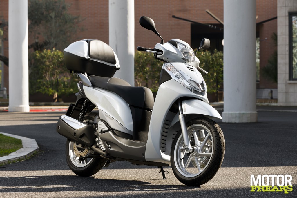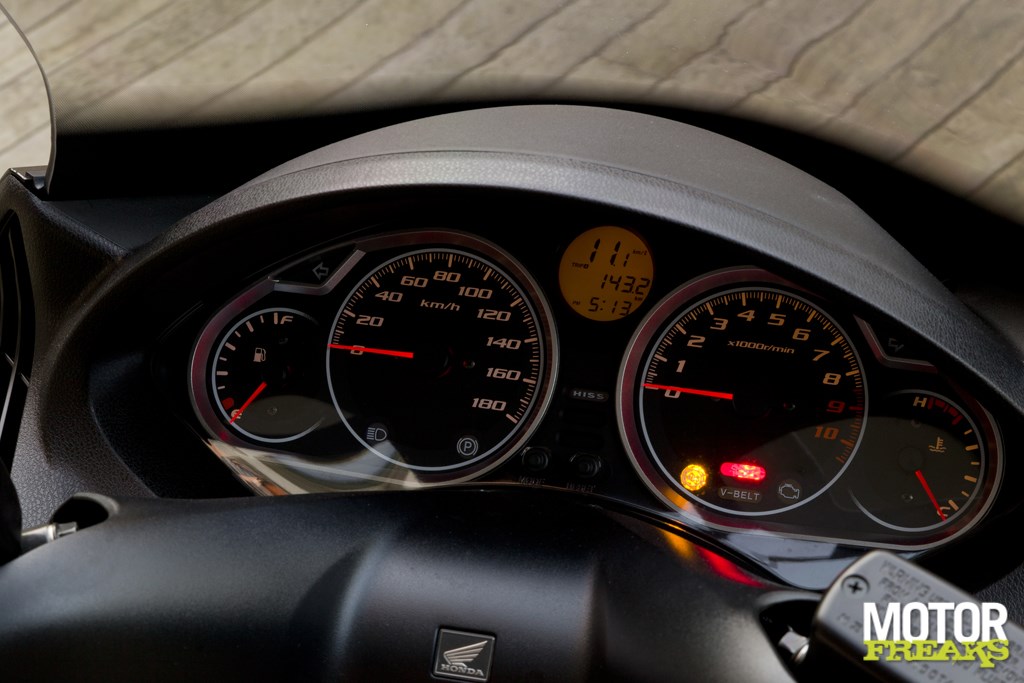 Honda zelf heeft daar echter direct een aardige oplossing voor; de topkoffer krijg je er standaard bij. Probleem opgelost. Ook de SH is voorzien van combined ABS, wat het gebruik van het motortje als wapen tegen congestie enkel bevordert. Nu houdt niets je meer tegen je als ware kamikaze in een gaatje van enkele decimeters te storten; mocht er onverhoopt iets veranderen, kun je gewoon vol in de ankers. Op elke ondergrond, bij elk weer. Honda heeft er hard aan gewerkt de SH een ‘typisch scooter’-achtige feel te geven. Zo is het hele stuur in kunststof gekapseld, met de tellers geintegreerd, zelfs de schakelaars hebben hun eigen plekje in het plastic. Best retro zo. Die tellers bieden overigens meer dan voldoende informatie; geen toerenteller zoals de SW-T wel heeft, maar wie zit daar nou op te wachten? En stiekem wordt bij het omdraaien van het contact wel even aangegeven dat we met een volledig digitaal dashboard te maken hebben; net als bij veel luxere modellen gaan alle wijzers eerst een keer heen en weer voordat ze tot rust komen op de correcte positie.