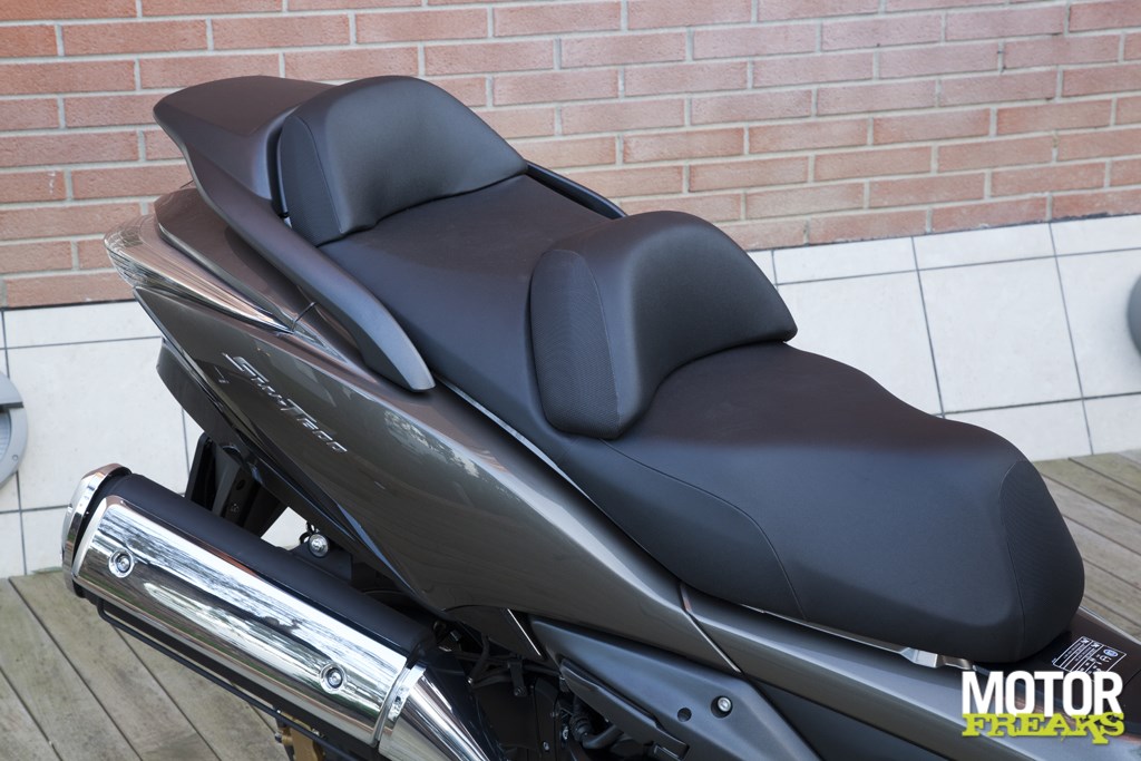 Hoe groot het verschil is tussen een statische presentatie en daadwerkelijk rijden zal vandaag nog een paar keer blijken, met name de scooters moeten het flink ontgelden als de heren jounalisten zich na het technische praatje rond de nieuwe modellen verzamelen. ‘daar kun je toch nooit je voeten kwijt’, ‘dat randje gaat in de praktijk nog knap in de weg zitten’ ‘daar past toch nooit serieus iets in’? en ga zo maar door. Zo wordt onder andere de steun op het zadel onder vuur genomen als zijnde lastig voor langere rijders en spijtig dat het niet verstelbaar is. In werkelijkheid heeft maar één scooter een (snel) verstelbare steun en is het met de rest gewoon werken met wat je krijgt. In de weg zitten doet het echter niet. Kan me niet heugen me er erg aan gestoord te hebben. Nou is het mogelijk dat uw verslaggever hier eenvoudigweg niet lang genoeg voor is, maar dat houdt in dat tenzij je te ver boven maainiveau uitsteekt, je prima zitten kunt. Ook de voetruimte is dik in orde op de SW-T.