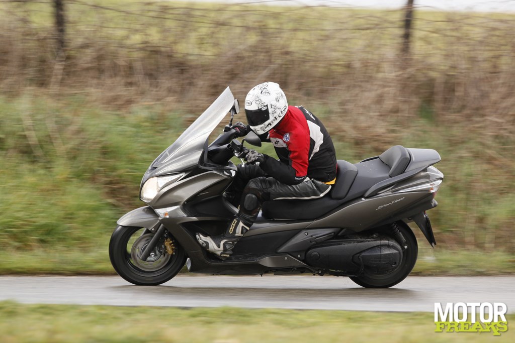 groep is het harmonica effect als een voorganger net niet zo snel blijkt te gaan als zijn achterligger denkt of deze nog niet gezien heeft dat er een bocht aankomt die wat vertraging vraagt. Bij motorfietsen is zoiets nog goed op te vangen met schakelen en gas dicht draaien, op de scooter is de rem gewoon noodzaak. Ook al omdat je door het gebrek aan schakelmomenten continu aan het accelereren bent als je eens wél gas geeft. Deze onwennige snelheidsbeleving hebben we jaren terug al eens aangekaart en is ook op de Honda’s weer gewoon aanwezig. Aard van het beestje misschien, het vergt gewenning en je moet er van houden. In dit geval ligt het aan de basis van een flink potje flipperen, enkel de bellen en scores ontbreken.