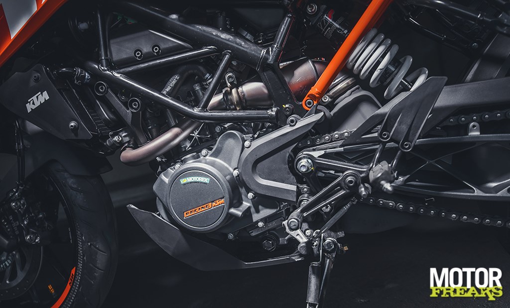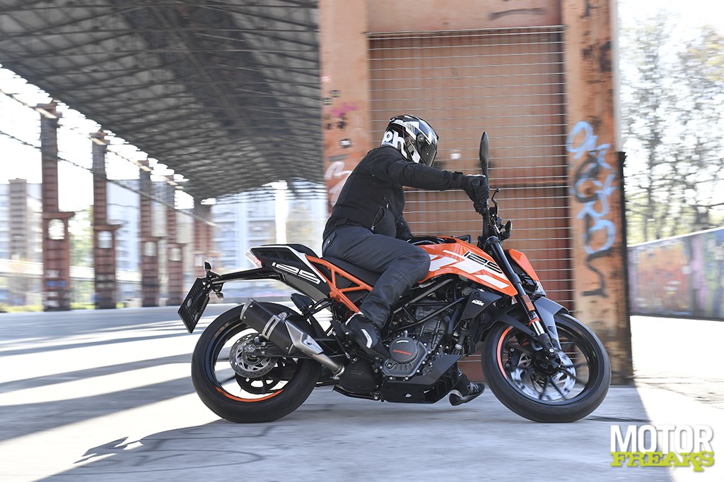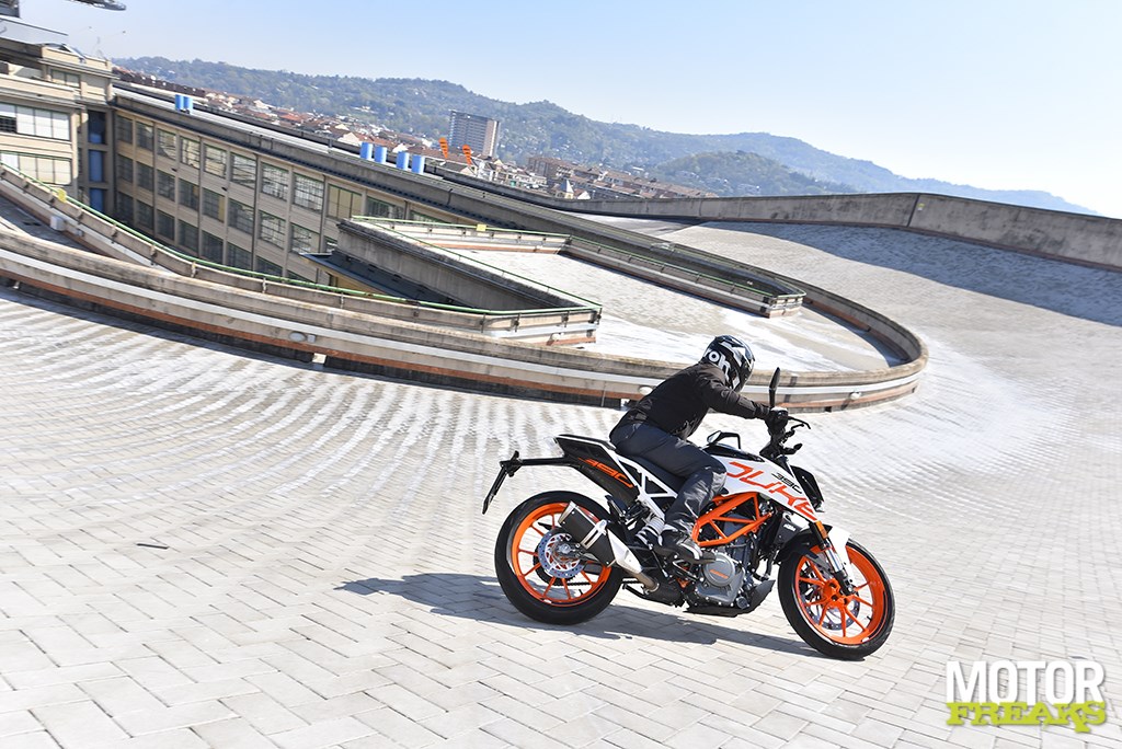Het tweede dat opvalt is hoe ontzettend soepel de vering is. Het wegennet van de Turijnse binnenstad varieert van hobbelige kinderkoppen tot asfalt met hobbels en bobbels en gaten en kuilen, al dan niet doorkruist door gladde tramrails, maar hoewel het er alles behalve comfortabel uitziet is daar op de 125 Duke niets van de merken, zo goed als de oneffenheden door de nieuwe WP vering wordt geabsorbeerd. De nieuwe 43 mm upside-down voorvork is van het open-cartridge type, wat voor een fiets voor het A1 rijbewijs best bijzonder te noemen is. Voor het iets sportievere gevoel heeft KTM de veerweg voor met 8 mm verkleind naar nu 142 mm, terwijl de nieuwe rechtstreeks gemonteerde WP monoshock met Separate Piston Technology eenzelfde veerweg als z’n voorganger van 150 mm heeft. De kwaliteit van de vering wordt in de kombaan op het dak van de oude FIAT fabriek in Turijn, die alles behalve strak te noemen is, nog eens extra onderstreept.