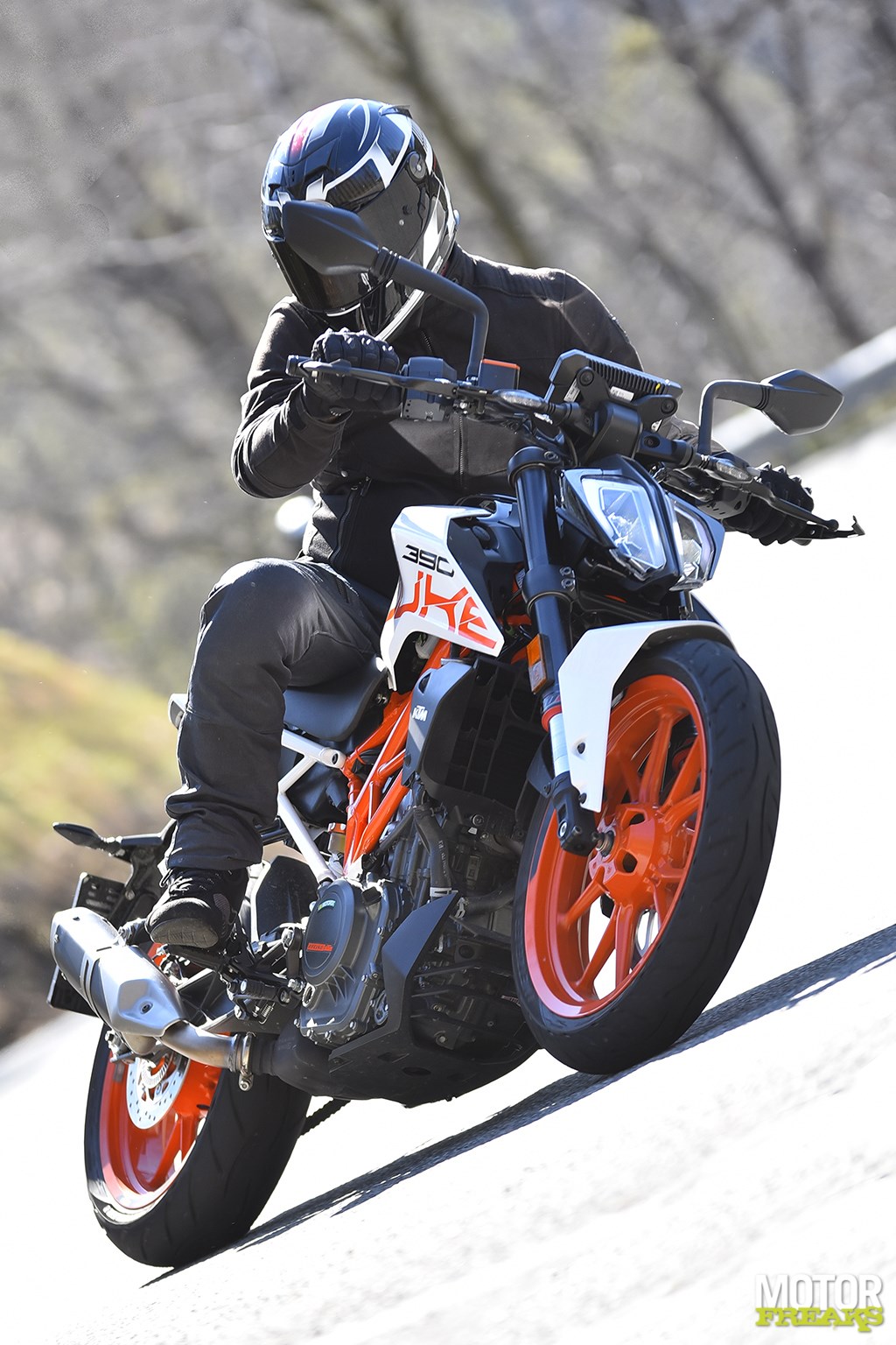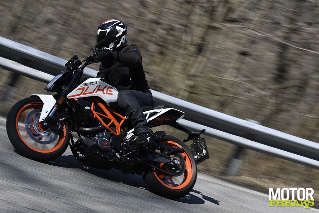 Vooral het eerste deel voor het eerste keerpunt is het asfalt op z’n zachtst gezegd hobbelig te noemen, maar dat deert de 390 Duke helemaal niets. Alsof je met een mountainbike bergaf aan het fietsen bent, zo gemakkelijk laat de 390 Duke zich van het ene op het andere oor leggen, maar dan wel een mountainbike met 44 pk. Net als bij de 125 heeft KTM ook bij de 390 Duke het werkgebied met 500 toeren verlaagd waardoor ‘ie net wat sneller in z’n powerband zit, en bovendien is de 390 er wat maximum koppel betreft ook nog eens 2 Nm (nu 37 Nm bij 7.000 toeren) op vooruit gegaan. Niet alleen kun je daardoor nóg vlotter de hoek om, bovendien is ‘ie nog gemakkelijker op het achterwiel te zetten, hoewel het vanwege de relatief korte versnellingen wel zaak is om direct op te schakelen.