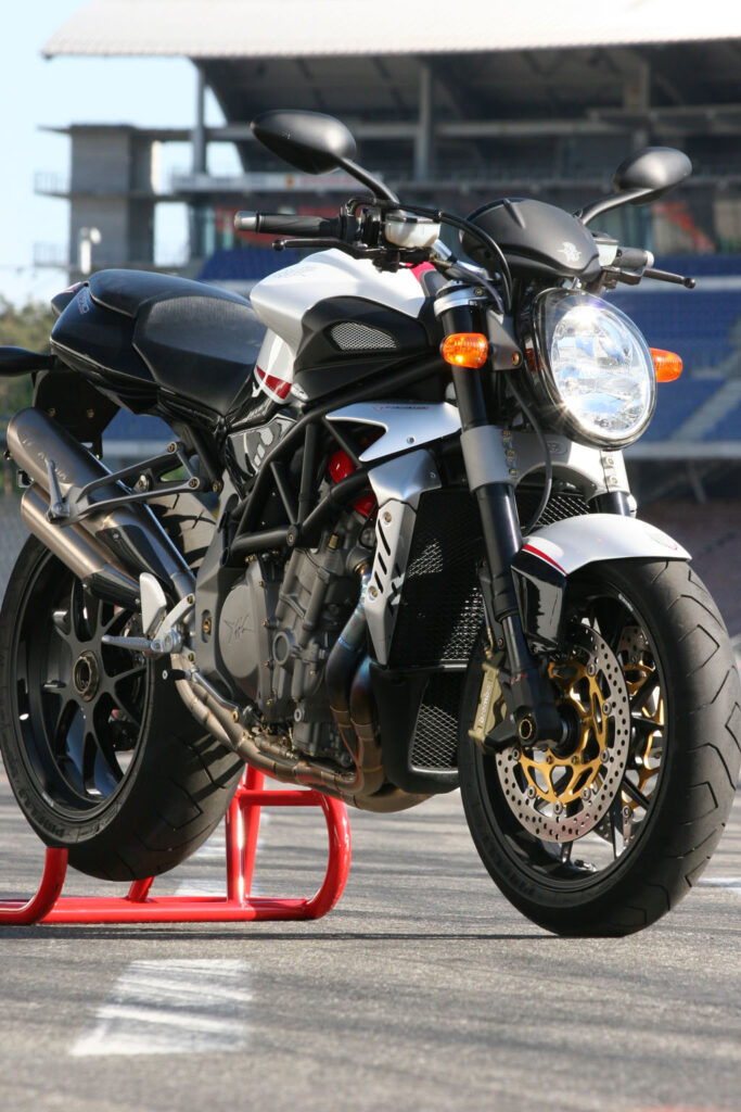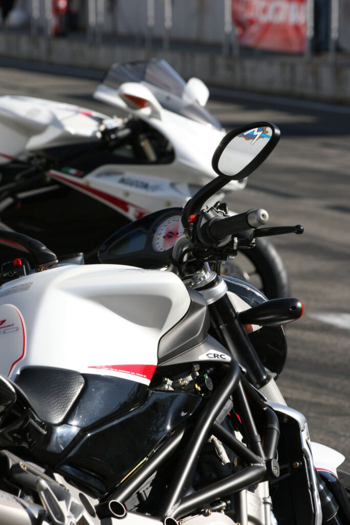 Een vraag die, zodra we de fiets de pitstraat uit rollen, direct positief wordt beantwoord. Natuurlijk, de melodie klinkt vanaf de eerste meters – letterlijk – bekend in de oren, maar dan wel een melodie als ware het een megahit die twintig jaar na dato nog steeds volle danszalen weet te trekken. En dat is nog wel het meest opmerkelijke aan beide modellen die al sinds begin deze eeuw op de modellenlijst van het exclusieve MV Agusta prijken. Daar waar een Ducati Monster je het gevoel geeft dat er wel eens wat nieuws mag komen, smelt datzelfde gevoel nog harder weg dan ijsschotsen door het broeikaseffect zodra je oog op deze MV Agusta modellen valt. Man-oh-man, nog steeds zijn dit twee van de mooiste ontwerpen ooit. Dank, meneer Tamburini, duizend maal dank. Het oogstrelende design, in combinatie met de zondermeer uitmuntende rijeigenschappen, maakt dat we hier maar niet genoeg van kunnen krijgen. Exclusiviteit heeft dan toch zijn voordelen,