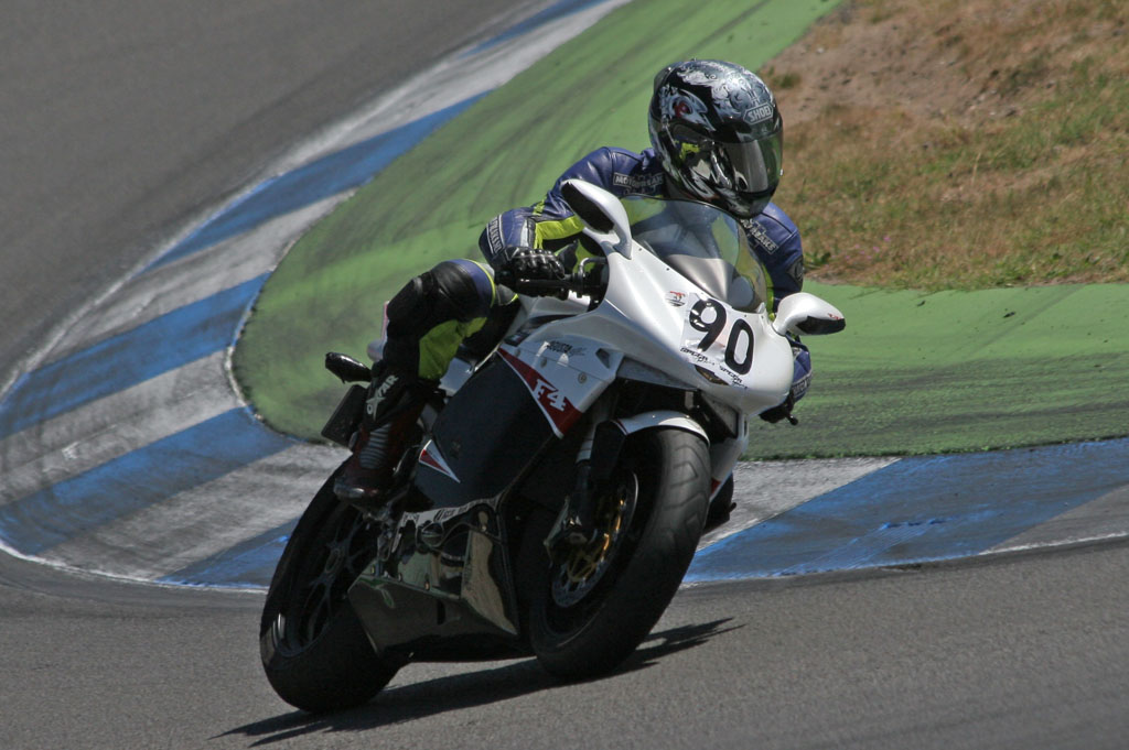 Snelheden die we vandaag op dit circuit helaas niet zullen ervaren, met dank aan Berry Eikelstone die het nodig vond dit ooit prachtige circuit danig te verkrachten, maar dat even terzijde. De eerste sessie was er – zoals gebruikelijk – een van aftasten van mens, machine en circuit, r312_910r_3_3.jpgnu was het tijd geworden om écht te gaan kranen. Hoewel, het is niet alle dagen dat we een fiets van vijfentwintig en noga ruggen over het circuit mogen jagen, en dan is het laatste wat je wilt ´t ding platleggen. Maar goed, van de andere kant is ook deze F4 een motor als elke andere die uiteindelijk op z’n rijeigenschappen zal moeten worden beoordeeld. Dus moesten we dat maar eens gaan doen.