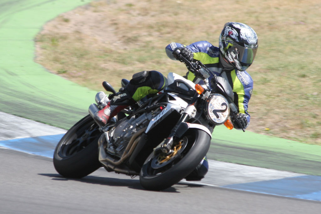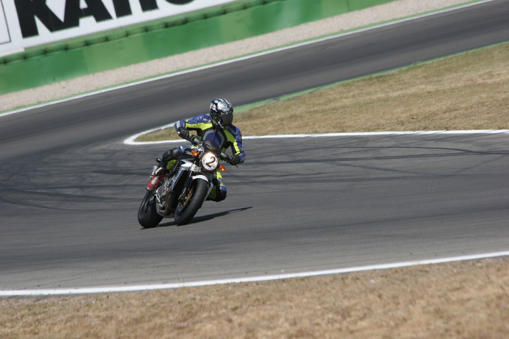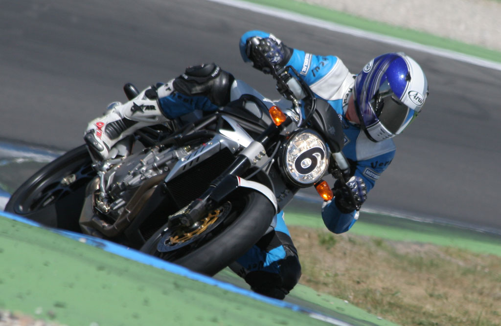 Konden we de F4 op de Hockenheimring nog op ietwat onderstuur betrappen, bij deze naked is van dat stuurgedrag niets terug te vinden. Met grote precisie laat de fiets zich over het circuit sturen, waarbij elke denkbare lijn mogelijk is. Iets wat in de drie krappe hairpins zeer zeker een voordeel is. Opvallend daarbij is dat, ondanks de korte gearing, de fiets erg goed het voorwiel aan de grond weet te houden. Natuurlijk, extreme acceleratie uit de bocht vertaalt zich in een voorwiel dat zo’n centimeter of 10 boven het asfalt zal zweven, maar daar blijft het dan bij. Geen ongecontroleerde wheelies die op zich wel stoer uitzien, maar je rondetijd niet ten goede zullen komen, maar gewoon beschaafd.