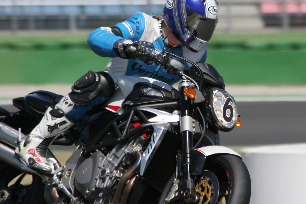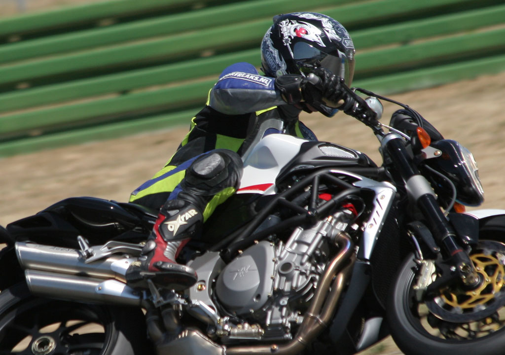 Stap op het zadel van de 910R en het eerste wat je zal opvallen is de extreme compactheid. Nu heb ik (Leon, red.) daar met mijn 1.89 meter al vrij snel last van, maar zelfs dwerg Ed, door vaders nooit verder geschopt dan 1.72 mtr, had precies datzelfde aangemerkt. Dat je, ondanks die compactheid, niet zowat dubbelgevouwen op de fiets zit is daarbij zondermeer een compliment dat toe te schrijven is aan ene meneer Tamburini. Alles zit waar het zou moeten zitten en in ‘massive attack’ mode laat de fiets zich gewillig over deze 4574 meter lange omloop sturen. Sterker nog: daar waar we bij de R312 het gevoel hadden met een ZZR1400 over een kartbaan te sturen, is het met deze 910R alsof je met een SXV4,5 op Monza aan het rijden bent. Daar waar de hairpins voor de F4 een drama vormen, neem je diezelfde bochten met de 910R met speels gemak. Sterker nog: ik denk dat er maar weinig mensen zijn die op dit circuit met een F4 harder rond zullen rijden dan met de Brutale. Enkel voor op het rechte stuk (die lange linker draai, je weet wel) zou je iets meer comfort wensen.