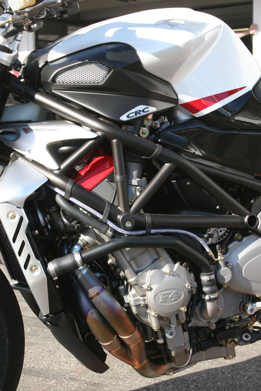 Meest in het oog springende detail waaraan beide “R” modellen te herkennen zijn, is de schitterende kleurstelling die beide fietsen hebben meegekregen. De tijd van Italiaans rood lijkt bij MV Agusta’s ontwerpers definitief “passé composé” en heeft plaats gemaakt voor een zwart/witte kleurstelling met subtiel verwerkte rode striping. Nu is zwart op supersport gebied sowieso retecool, maar zwart in combinatie met parelmoer wit – dat de motor in de brandende zon een nóg exclusievere uitstraling geeft – is helemaal da bomb. Hoe goed daarbij zelfs over het kleinste detail is nagedacht, valt meteen op zodra je een blik richting de Brutale gaat werpen. De zojuist genoemde rode striping, die bij de F4 R312 vanuit de tank doorloopt over de kuipdelen, loopt bij die Brutale namelijk subtiel over in een in kleur gespoten kleppendeksel. Om visueel hetzelfde effect te creëren. Need we say more?