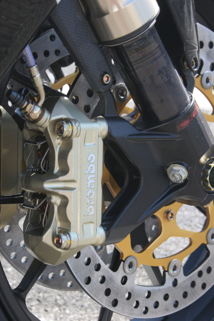 (maar liefst 4 kg lichter dan de standaard ‘ster’ spaken die de 910S sieren), de Brembo goldlines (in plaats van de 6-zuiger nissins) en de van zwarte nitride coating voorziene Marzocchi voorvork zijn daarbij rechtstreeks overgenomen van de R312, wat maakt dat deze Brutale in alle opzichten een naakte variant is van die F4.