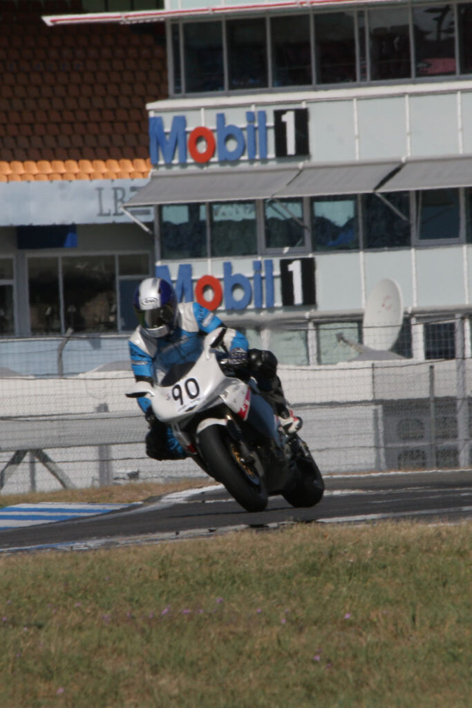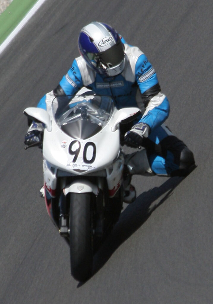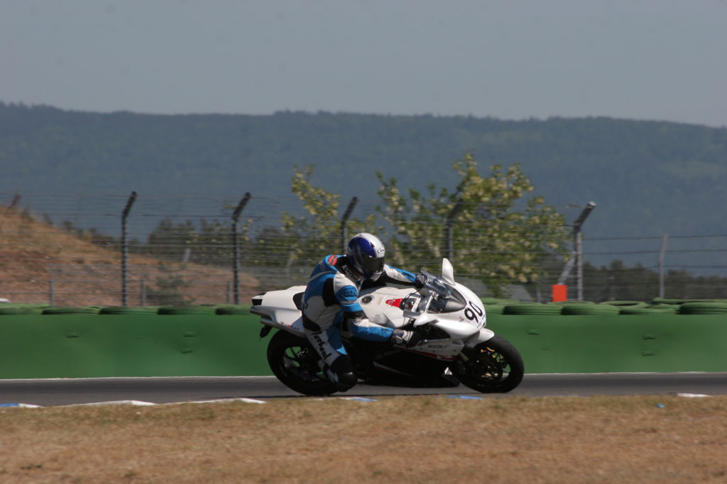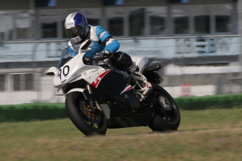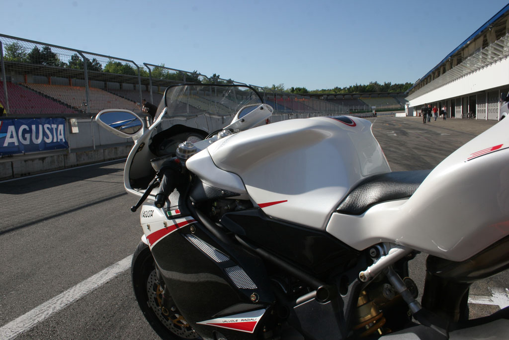Pas in de derde sessie weten we ons de fiets ‘eigen’ te maken, waarbij moet worden aangetekend dat op ons verzoek de veringspecialist van MV Agusta hard aan het werk was geweest om een en ander qua vering te verbeteren. Nog steeds heeft de motor de neiging om naar buiten te drijven (in een oogomslag de fiets naar de apex sturen is deze fiets vreemd), maar zowel het aanremmen als ook het uitaccelereren gaat inmiddels stukken beter. De eerder gereden hoogste snelheid van284 km-u weten we niet meer te verbeteren, maar dat had meer met onze veiligheidsmarge te maken dan met de rijcapaciteiten van de F4. Zeker weten dat met het rempunt op de juiste plek (en dus niet belachelijk vroeg zoals wij deden) 300 km/u haalbaar was geweest. Bizar, zeker als je ervan uit gaat dat deze baan eigenlijk geen echt recht stuk meer heeft.