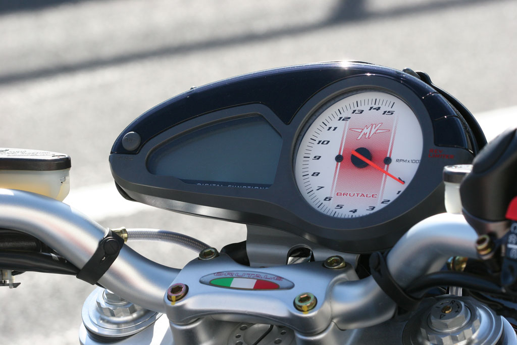 De Brutale 910R een fiets met een eigen uiterlijk, agressief maar ook geraffineerd, de combinatie van gebruikte materialen en kleurstelling geeft deze fiets een eigenzinnig gezicht. De dubbel geplaatste uitlaten met het open enkelzijdig opgehangen achterwiel is iets waar we nog steeds voor wegsmelten. Grote verbetering ten opzichte van de standaard Brutale is de 50mm Marzocchi Upside Down voorvork die, net als bij de R312, een rots in de branding is die maakt dat je onvoorstelbaar hard en diep de motor de bocht in kunt remmen. Daarbij een scala aan informatie doorgevend die je zou wensen ter overdracht middels een USB-stick in je hersenpan te steken. (Niet alleen weet hij precies door te geven hoe diep het putje in asfalt is,