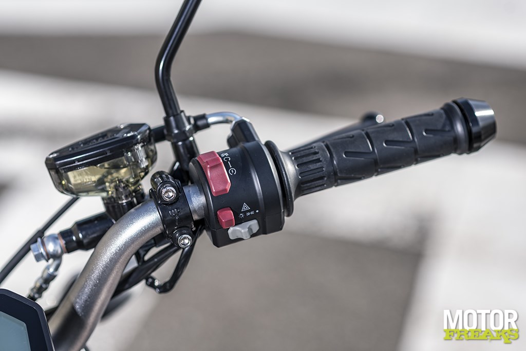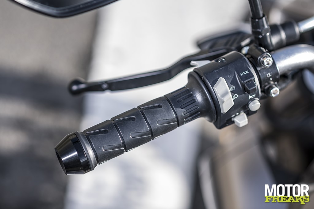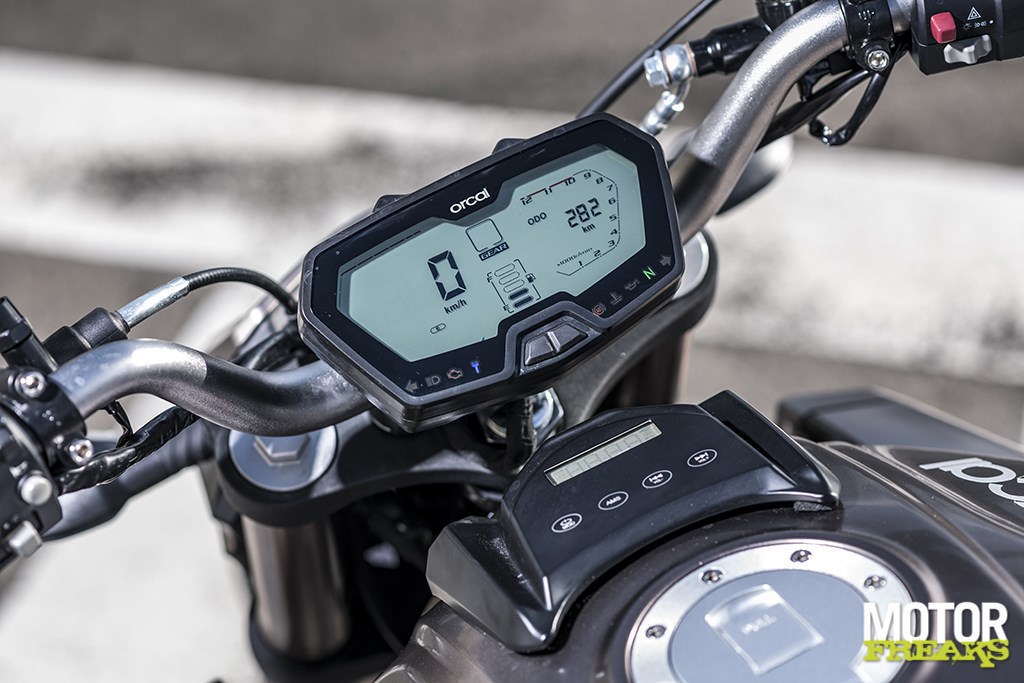 Vanuit het zadel heb je prima zicht op een overzichtelijk LCD display, waaruit de noodzakelijke informatie afleesbaar is – odometer, tripmeter, versnellingsindicator, tankmeter – maar dat helaas niet vanaf het stuur de bedienen is. Eenmaal de motor op contact gaat een blauw controlelampje branden dat de vorm van een contactsleutel heeft, wat bij navraag inderdaad een controlelampje voor de contactsleutel blijkt te zijn. Zodat je weet dat de sleutel in het contactslot zit. Alsof je dat nog niet zou weten omdat het display ‘aan’ is. Nog grappiger dan dat controlelampje is het display op de tank, dat geen display maar een onboard muzieksysteem blijkt te zijn, met FM functie, Bluetooth connectiviteit en een USB-aansluiting om je eigen muziek te luisteren. Té grappig.