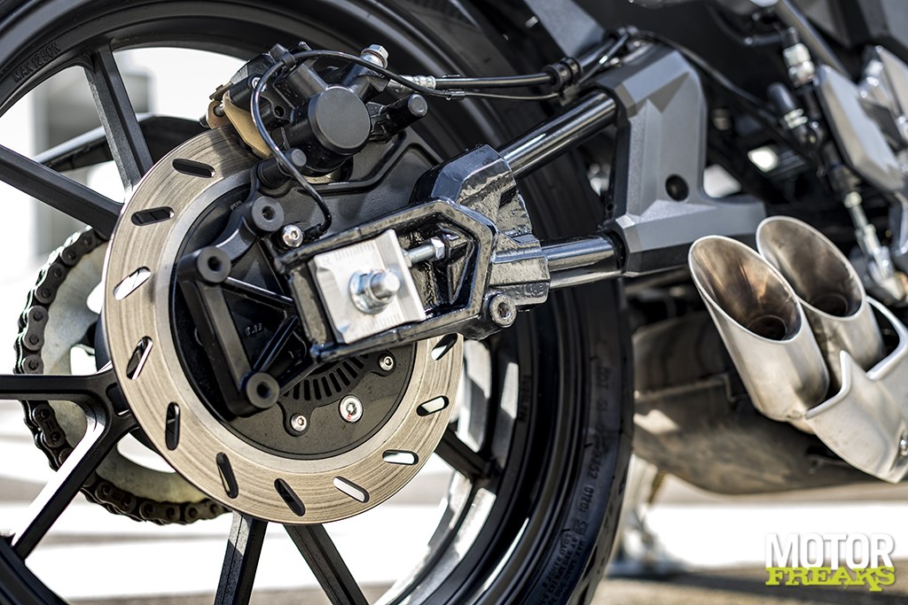 Is dit nou wat ze in Frankrijk "Joi de vivre" noemen? 300 mm schijf met radiale vierzuiger remklauw, die op het oog verdomd veel op Yamaha’s remklauw lijkt – maar dan volledig in ’t zwart waar bij Yamaha de zuigerbussen bij de MT-serie aluminiumkleurig zijn.