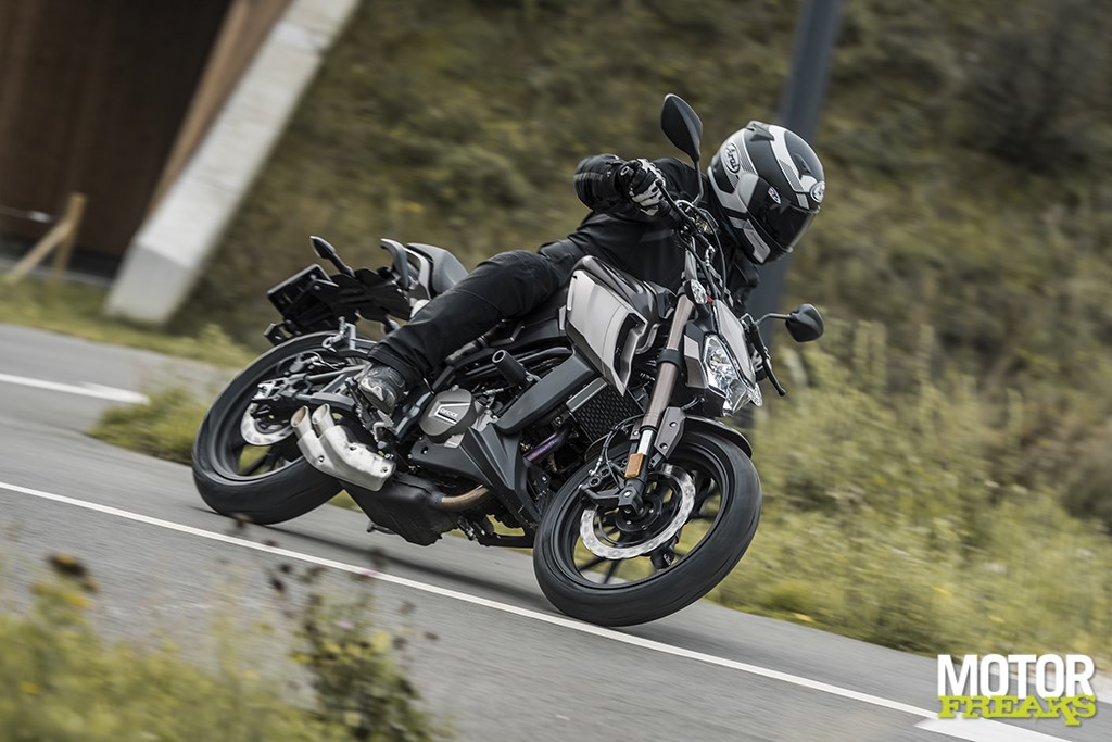 van een lichte motor verwachten zou, maar doordat het zadel aan de voorkant bij de tank smal is van vorm krijg je nog steeds probleemloos je voeten plat aan de grond. Ik in ieder geval wel en met 1,72 meter lengte weet ik dat ik niet van de grootsten ben. De voetsteunen zitten iets naar achteren en het omhoog gebogen stuur zit lekker binnen handbereik, wat heeft geresulteerd in een ontspannen zit die door iets naar achteren te schuiven in een sportieve zit te transformeren is. Precies zoals je van een Naked met sportieve aspiraties verwacht.