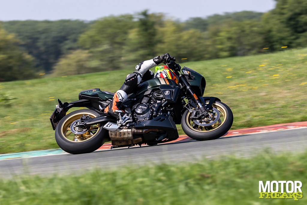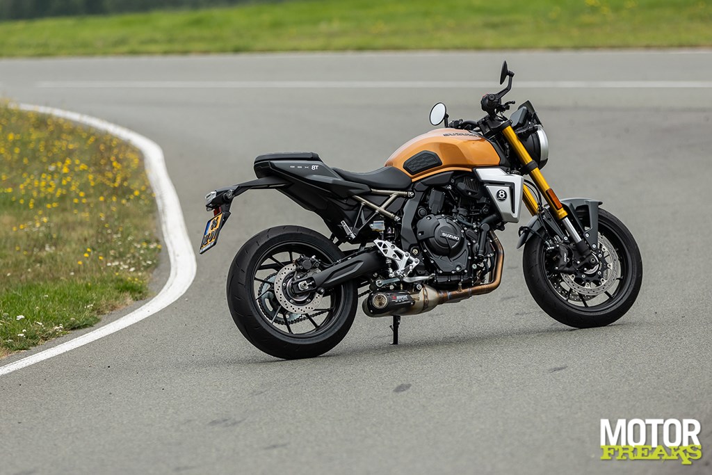 Instelbare vering zou de GSX-8T en TT zeker niet hebben misstaan, om deze motor nog net effe wat beter af te kunnen stellen, maar helaas is dat niet geval. Gelukkig is de demping van zowel voor- als achterzijde voor sportief gebruik zeker acceptabel, mits je ervoor zorgt dat je vooral vloeiend rijdt en je zithouding voor het insturen van een bocht al in orde hebt. Vering en banden geven voldoende feedback en doen hun werk naar behoren waardoor je best wel aardige hellingshoeken kunt rijden. Op dit circuit wordt er veel onder hellingshoek geremd, doe je dit echt laat en hard dan grijpt het ABS resoluut in maar bij op tijd en vloeiend remmen verloopt dit probleemloos zonder ABS-interventie. Enkel de veervoorspanning van de achterveer is instelbaar en we hebben