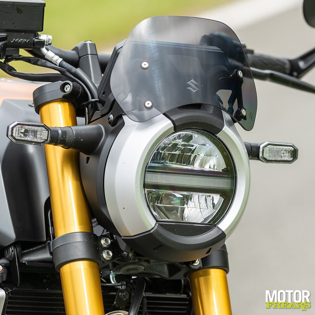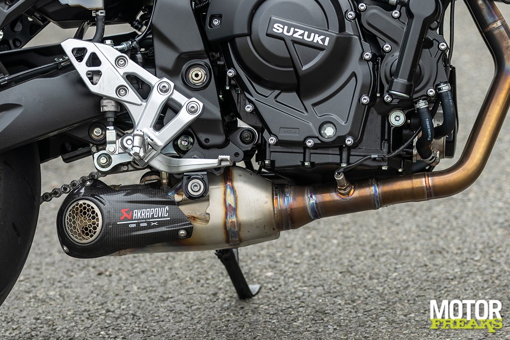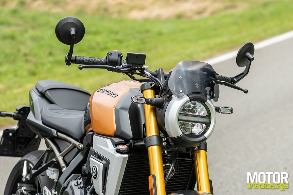 waardoor er een compactere en meer ontspannen zit is ontstaan. Daarnaast heeft de GSX-8T een iets (5 mm) hogere zithoogte. Dat lijkt niet veel, maar geeft wel een heel andere rijervaring”, aldus Rico. “Verder zijn er meer premium onderdelen gebruikt, waaronder het zadel (dat van de T nog wat meer pluche is dan de TT), de bar-end spiegels, de knipperlichten en de fraaie ronde koplamp met LED-dagrijverlichting. Het koplampkuipje, dat doet denken aan een oude GPZ, is standaard bij de TT, evenals de korte onderkuip rond het blok, waar de TT van een minuscuul flyscreen en een Akrapovič uitlaatsysteem is voorzien, dat trouwens niet veel luider klinkt dan het standaard systeem, omdat het ook aan Euro 5+ voldoet.