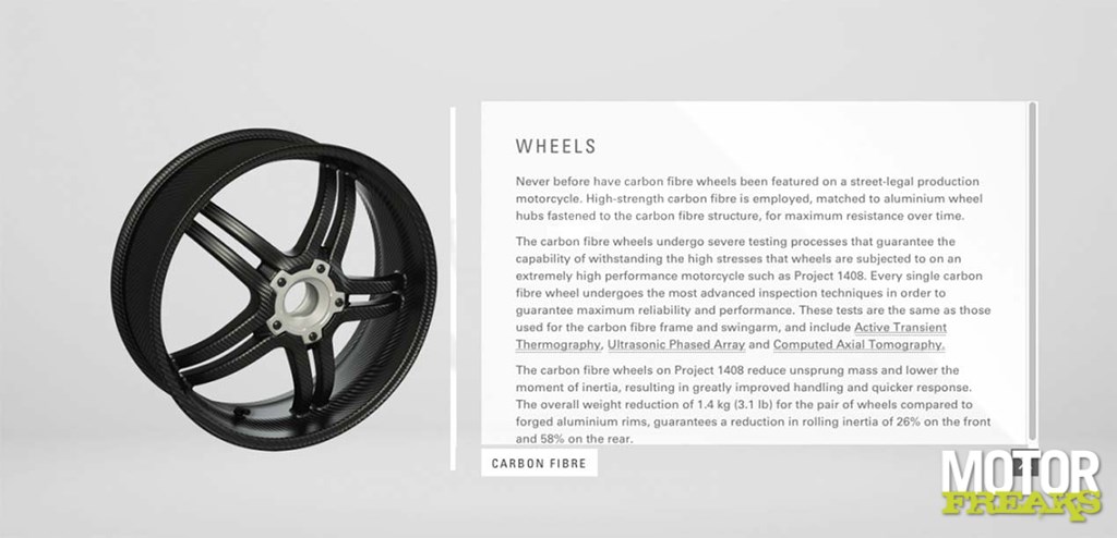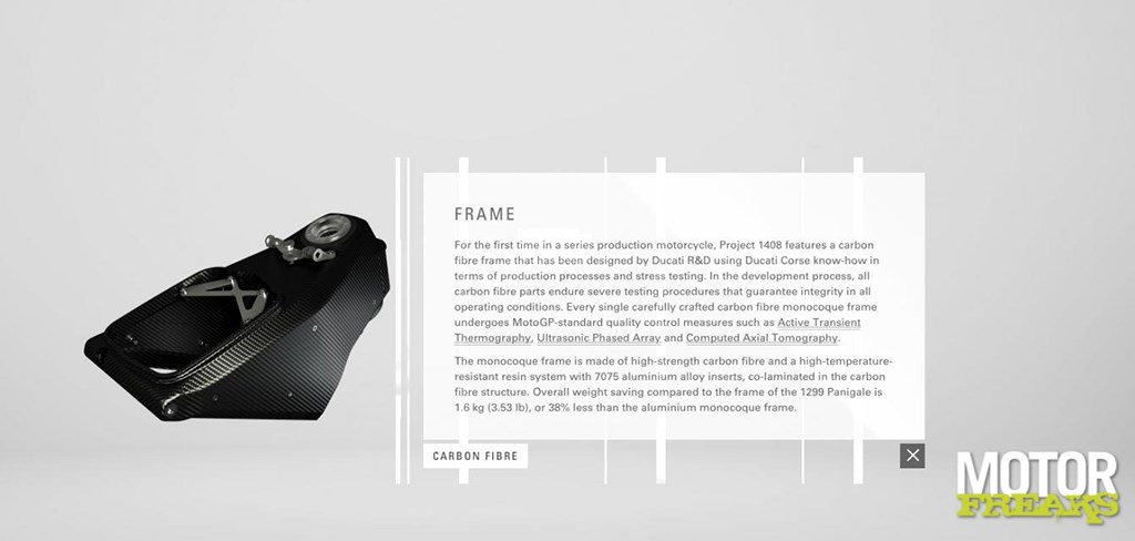 De airbox die dienst doet als dragend deel van het monocoque frame, de achterbrug, de wielen en de complete stroomlijn is van het exotische materiaal vervaardigd. Volgens de informatie die op de microsite te lezen is, heeft Ducati daarmee flink wat aan gewicht bespaard. De airbox is 1,6 kg lichter (38% t.o.v. aluminium), de achterbrug 900 gram (18% t.o.v. aluminium) en bij de wielen is 1,4 kg aan gewicht bespaard. Volgens Ducati scheelt dat laatste aan massatraagheid 26% voor en 58% achter.