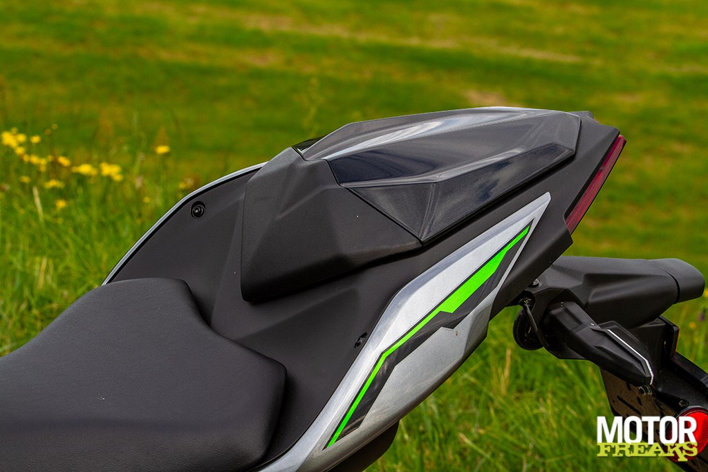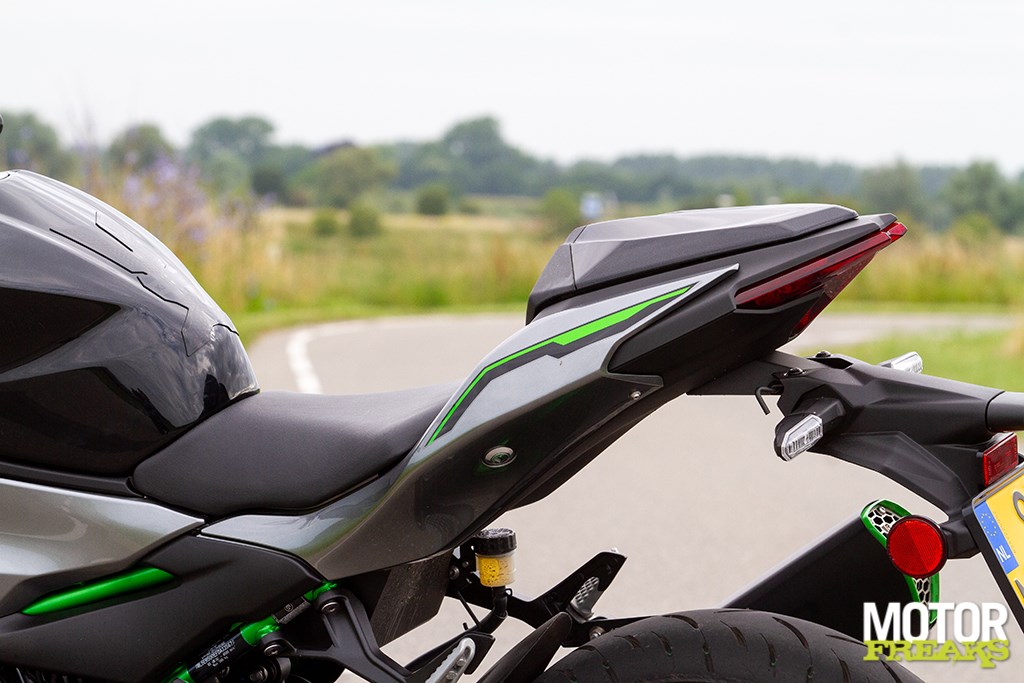 Ook onderdeel van het Performance pakket is de afdekkap voor de duozit. De soort van bellypan is daarentegen standaardDat heeft naast de meer ontspannen zit als tweede voordeel dat je meer met je neus in de wind zit, hoewel dat wel afhankelijk van de buitentemperatuur is. Superlekker bij temperaturen van boven de 30° Celsius, maar afzien zodra deze onder de 5° Celsius zakt. Daarnaast heeft de meer ontspannen zit, plus ‘geen stroomlijn’ als negatief effect dat het verbruik iets hoger ligt.