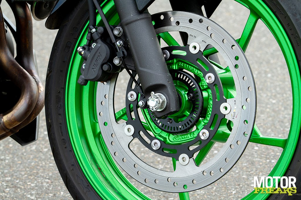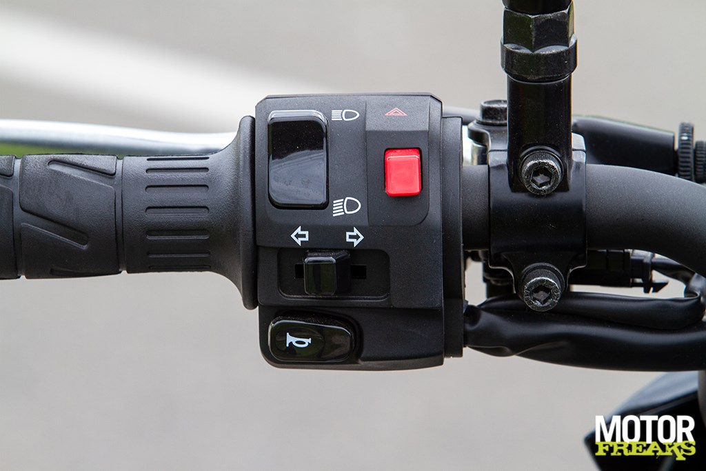 Supercool rooster over de uitlaat. De remmen ogen simpel, maar dat is helemaal niet erg. Je hebt ze ook alleen maar voor het hoogst noodzakelijke nodig. Voor de rest gewoon insturen en knallen