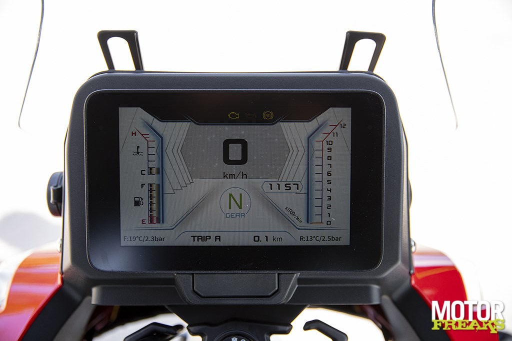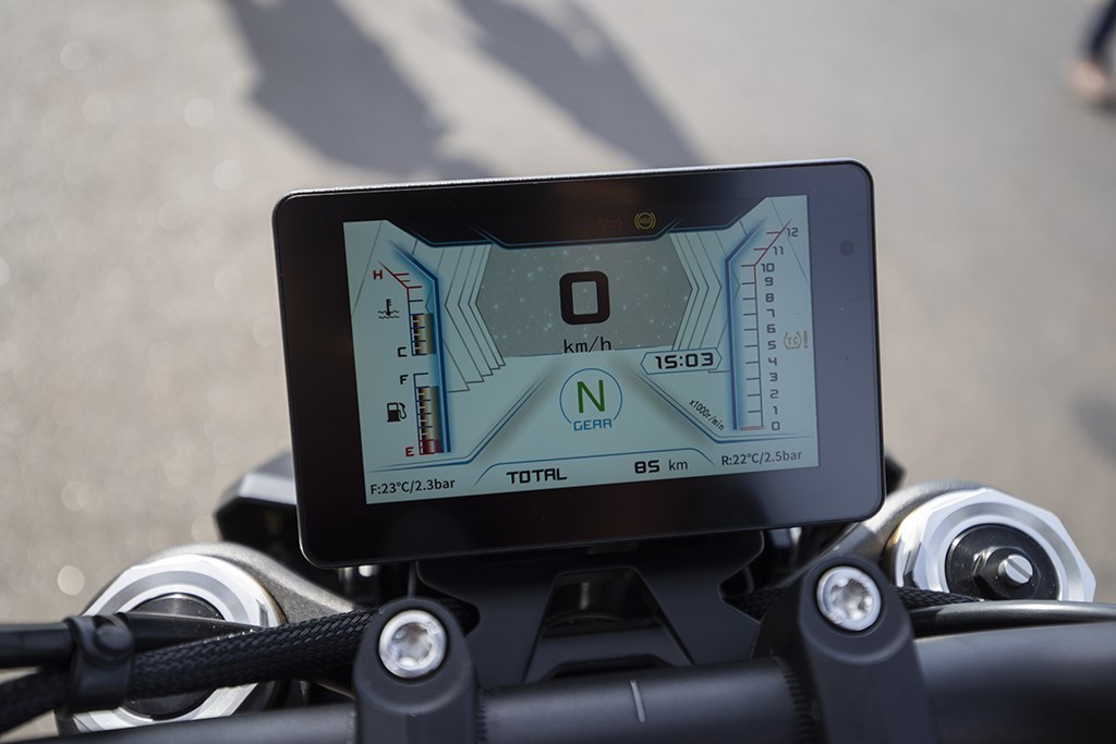 Vanuit het zadel heb je zicht op eenzelfde TFT-kleurendisplay als de SRK 800 RR, dat de belangrijkste informatie overzichtelijk weergeeft: snelheid, toerental, gekozen rijmodus en gekozen versnelling. Daarnaast wordt ook de bandenspanning en bandentemperatuur weergegeven, plus nog een klokje en de odometer/tripmeter (1 en 2), maar dan heb je het zo’n beetje wel gehad. Iets meer boordinformatie zou mooi zijn geweest. De bediening, via twee knoppen op het stuur, zouden we niet als bepaald gebruiksvriendelijk willen bestempelen, niet voor niets dat de meeste merken op