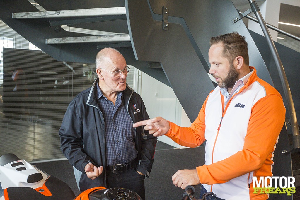 Het zal dé belangrijkste klapper zijn van KTM op de komende EICMA in Milaan, de vorig jaar als prototype gepresenteerde 790 Duke die is voorzien van een in eigen huis ontwikkelde paralleltwin, door de Oostenrijkers de LC8c gedoopt – waarbij de kleine letter c voor ‘compact’ staat. Onder leiding van Philipp Habsburg, vicepresident van de R&D afdeling van KTM, hebben de engineers de afgelopen drie jaar aan dit project gewerkt dat in eerste instantie voor twee totaal verschillende modellen zal worden gebruikt, de Duke streetrod en de multipurpose 790 Adventure. Verwacht een range aan verschillende modellen die gebruik gaan maken van hetzelfde motorblok dat in de toekomst KTM’s bestverkochte onroad segment zal vertegenwoordigen. Tenminste, dat is de verwachting van KTM AG raad van bestuurslid Gerald Kiska, wiens in Salzburg gevestigde Kiska Design verantwoordelijk is geweest voor alle KTM modellen sinds 1992, het jaar dat KTM door Stefan Pierer werd overgenomen. En dat is inclusief het ongespoten 790 Duke prototype dat op me stond te wachten bij het KTM De man die vanaf de wederopstanding van KTM verantwoordelijk is geweest voor elk ontwerp: Gerald KiskaTechnologies gebouw aan de andere kant van de weg tegenover Kiska Design, waar ik me mocht melden voor een exclusieve eerste kennismaking met dit significant nieuwe model in de geschiedenis van KTM – inclusief een korte rit op dit goed gebruikte prototype.