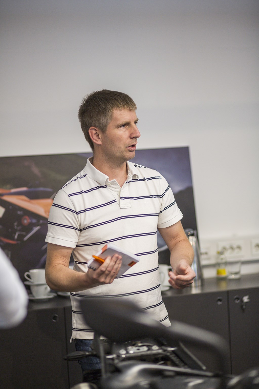 Statische foto's willen we niet, je moet bij elke foto bij de motor blijven staan. Als ik nu hier ga staan, dan kunnen ze dat op de redactie wel kroppen, toch?